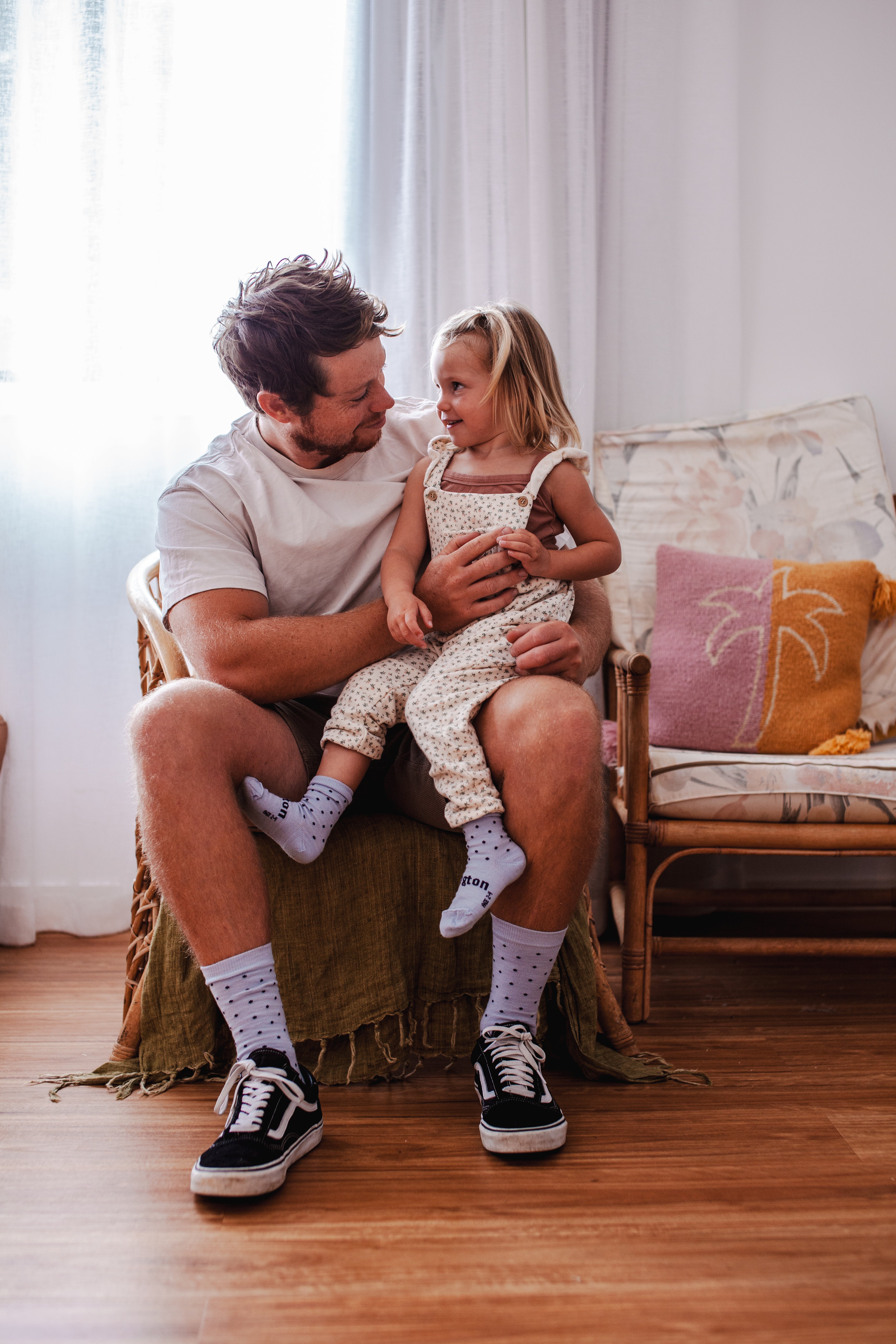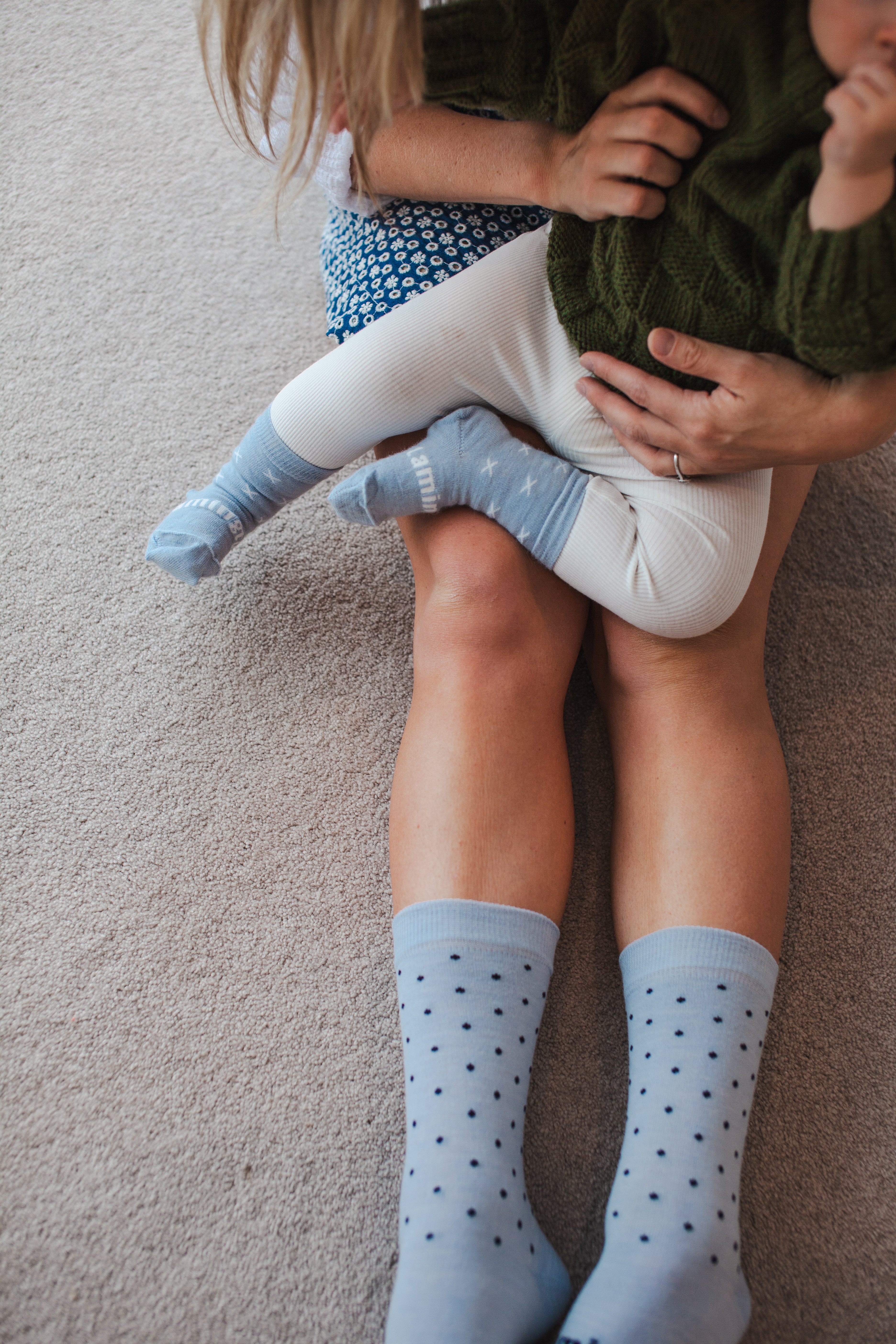 Babies come in all shapes and sizes. Our sizes are a guideline only and are not a one size fits all. To ensure your socks are not too tight on your infant always place a finger between your baby’s skin and the band of the sock to make sure the items are not restrictive. If you think they are too firm either scrunch the sock down, fold over the cuff, or go to the next size up. Alternatively use our Crew length socks which sit lower on the leg. Our knee high socks are designed to be worn below the knee.