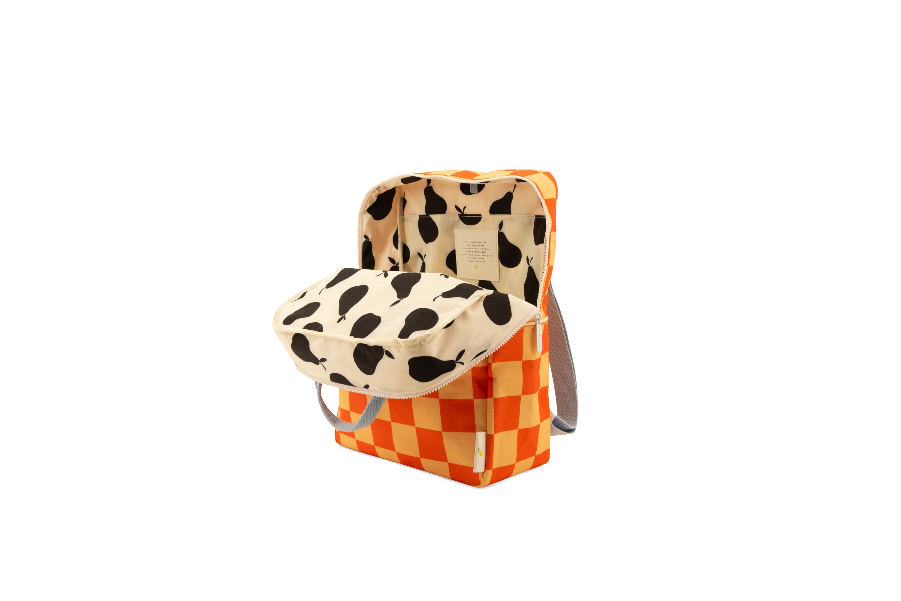Yay! These backpacks are made of recycled PET bottles. On the front you find an extra pocket. The lining is waterproof. The zippers are from YKK and the shoulder handles are adjustable. On the inside you'll find an elastic bottle holder and a pocket all over the back that closes with velcro. On the name tag you can write down your name and contact details. The inside has a pear pattern all over.