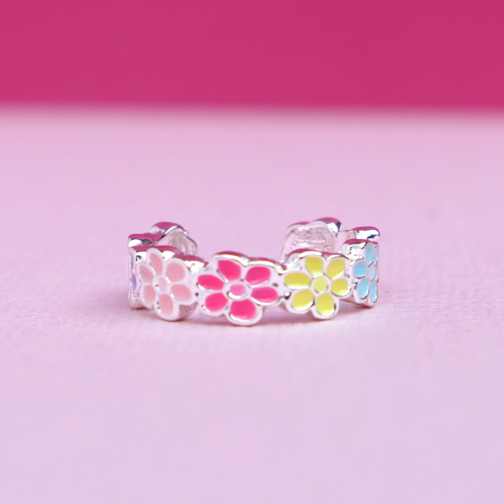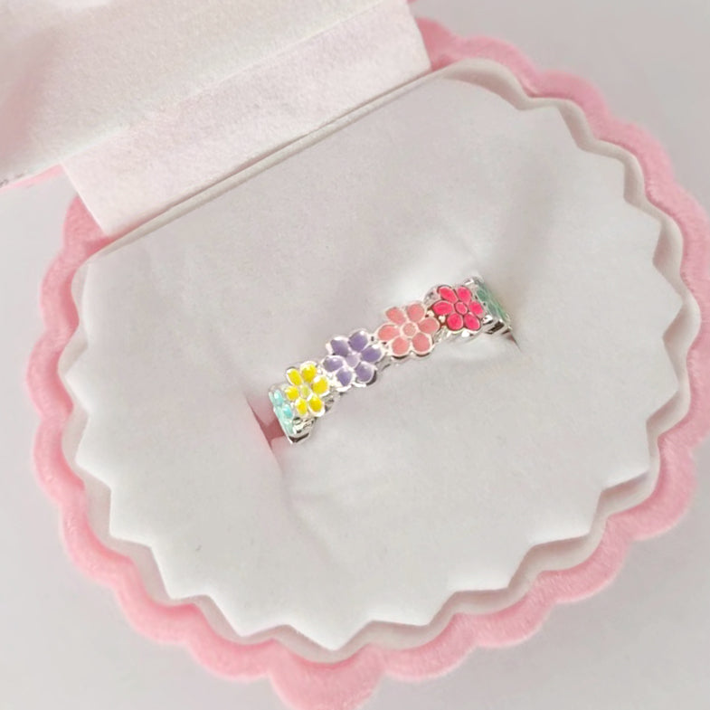 Enjoy the loveliness of Spring blooms with the Rainbow Bouquet Ring, a wonderful array of colourful flowers from start to end. With a repeating pattern of five different colours, this ring is vibrant in nature and full of verve.