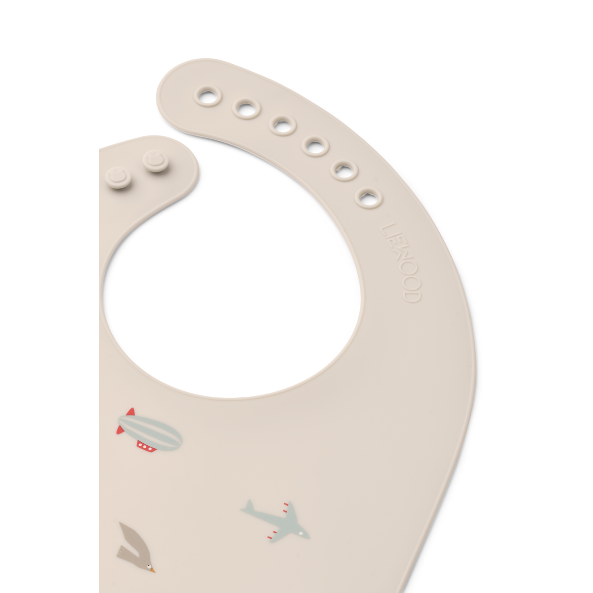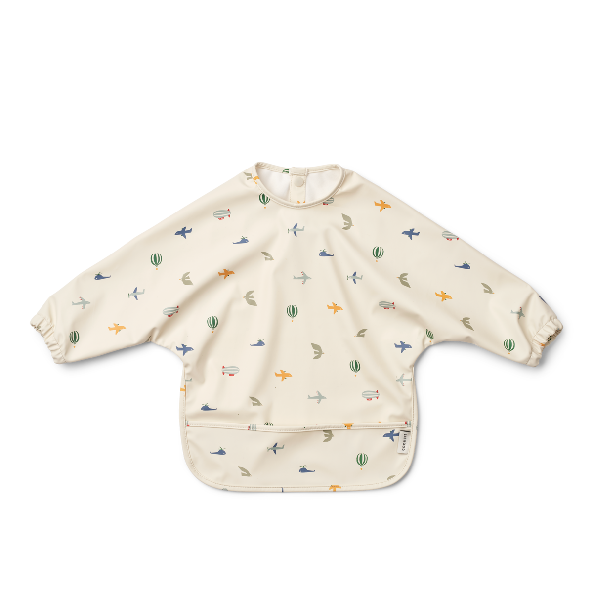 Lightweight cape bib for children who are learning to eat. The recycled material makes it instantly re-usable: simply rinse and wipe clean.
