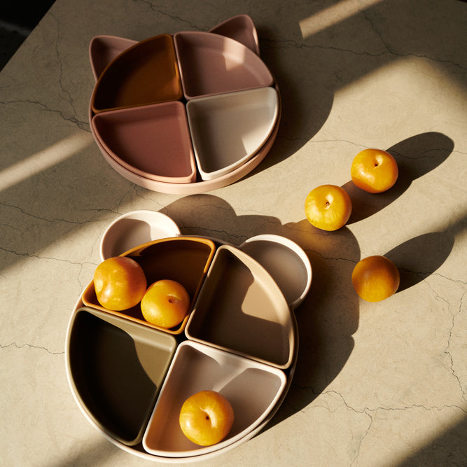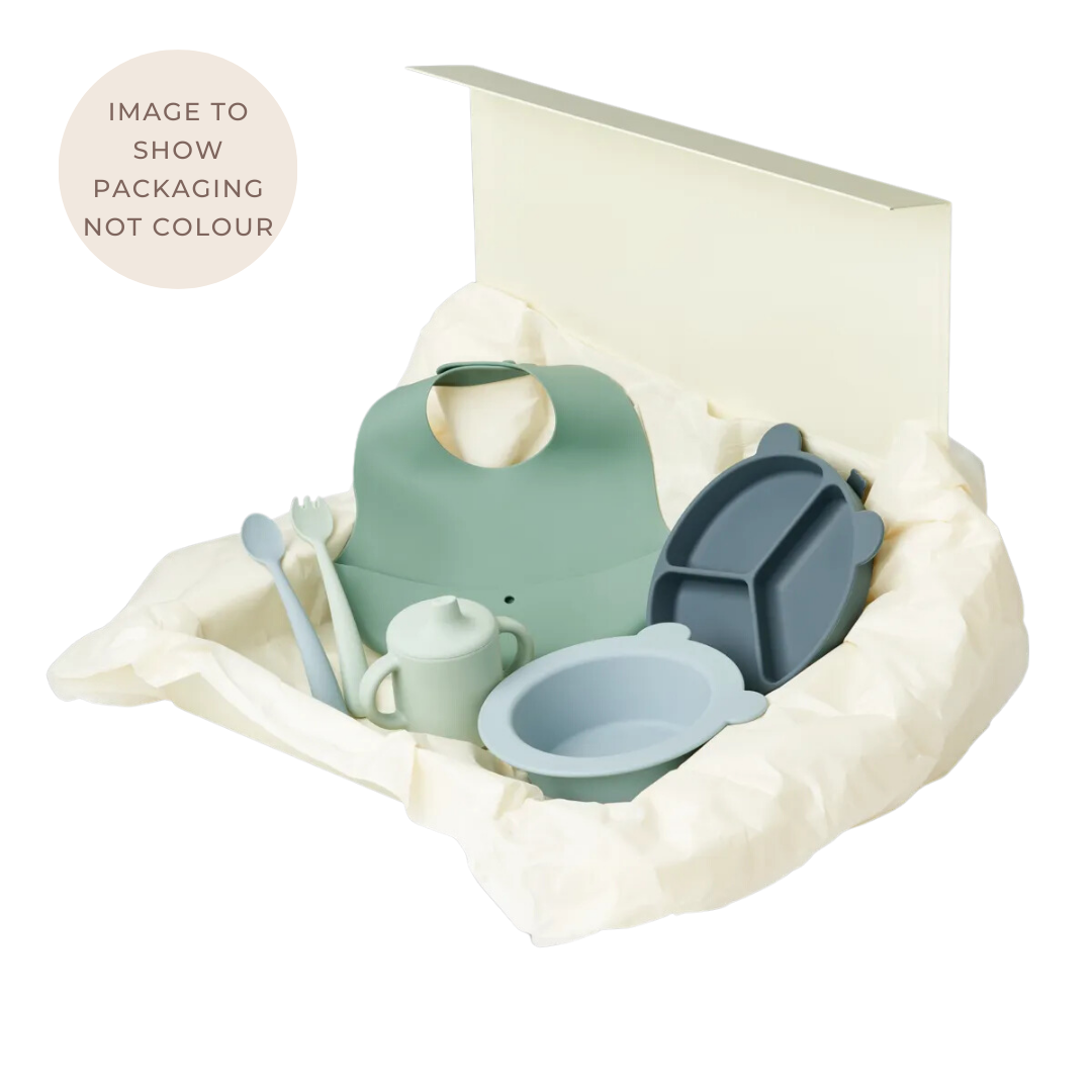 - Set includes: Neil cup, Peony suction bowl, Siv feeding spoon, Scott fork, Stacy divider suction plate and Ember bib.