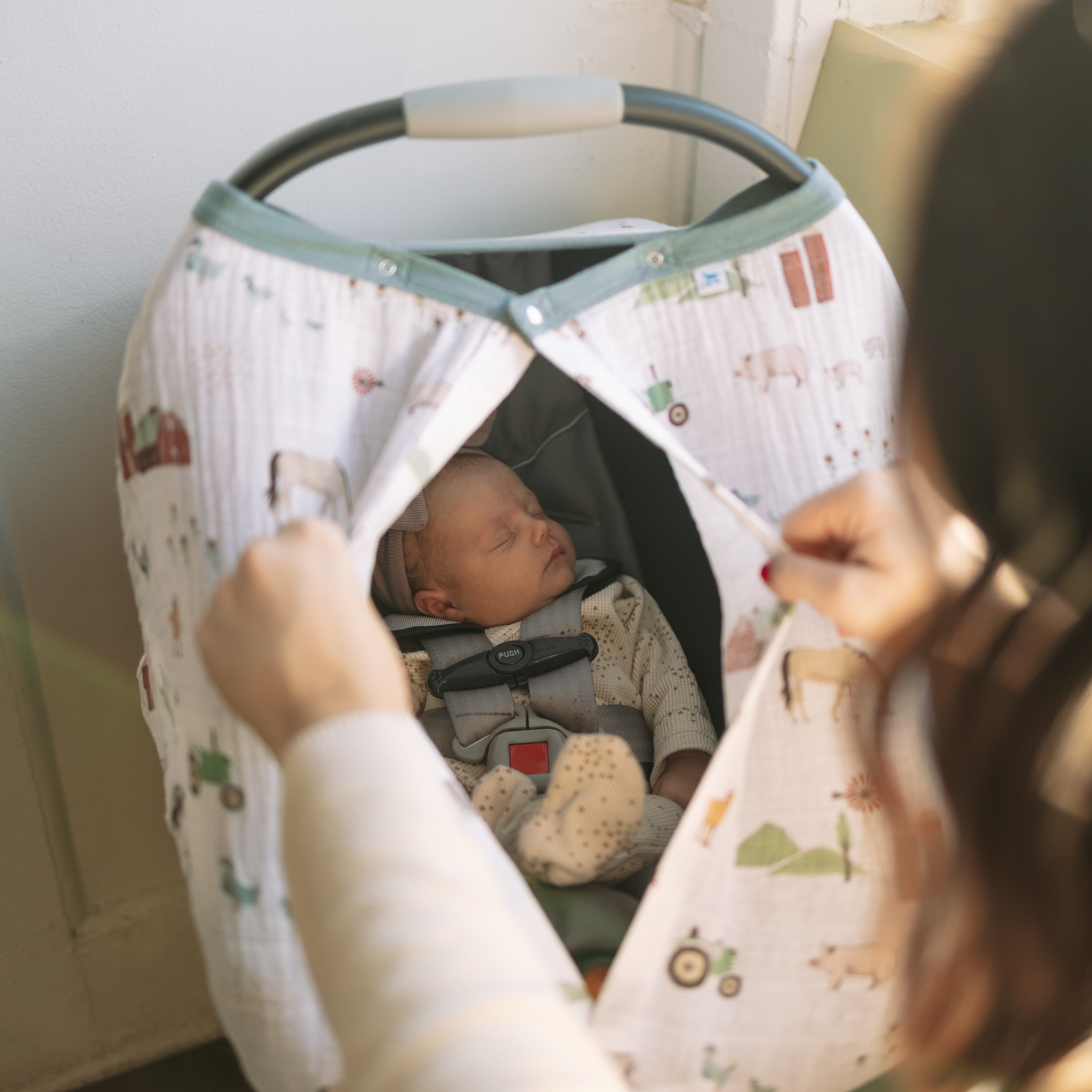 With darker muslin fabric, Little Unicorn recommend washing 2 times before use. Machine wash cold with like colours and like fabrics. Tumble dry on low heat or hang dry. Do not iron.