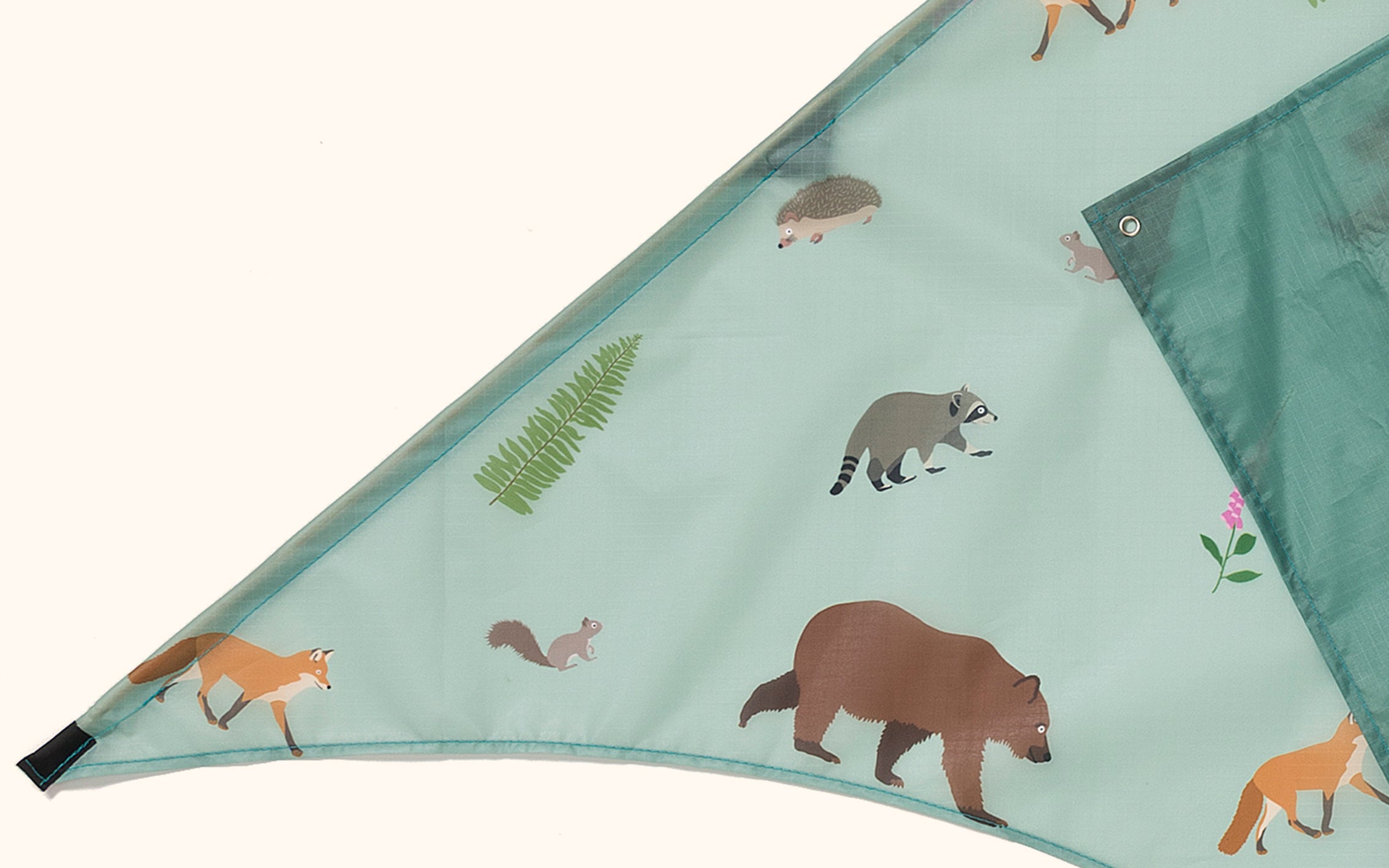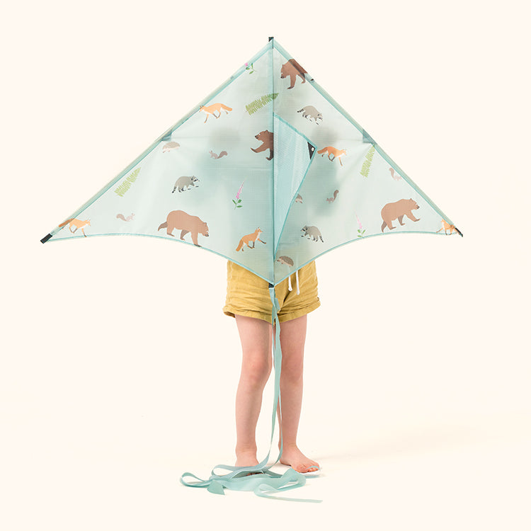 A crowd of cute and curious critters. The design of this kite features a grizzly bear, a fox, a hedgehog, a squirrel and a racoon giving some serious side-eye. There is so much to love about the creatures on the Woodland kite.