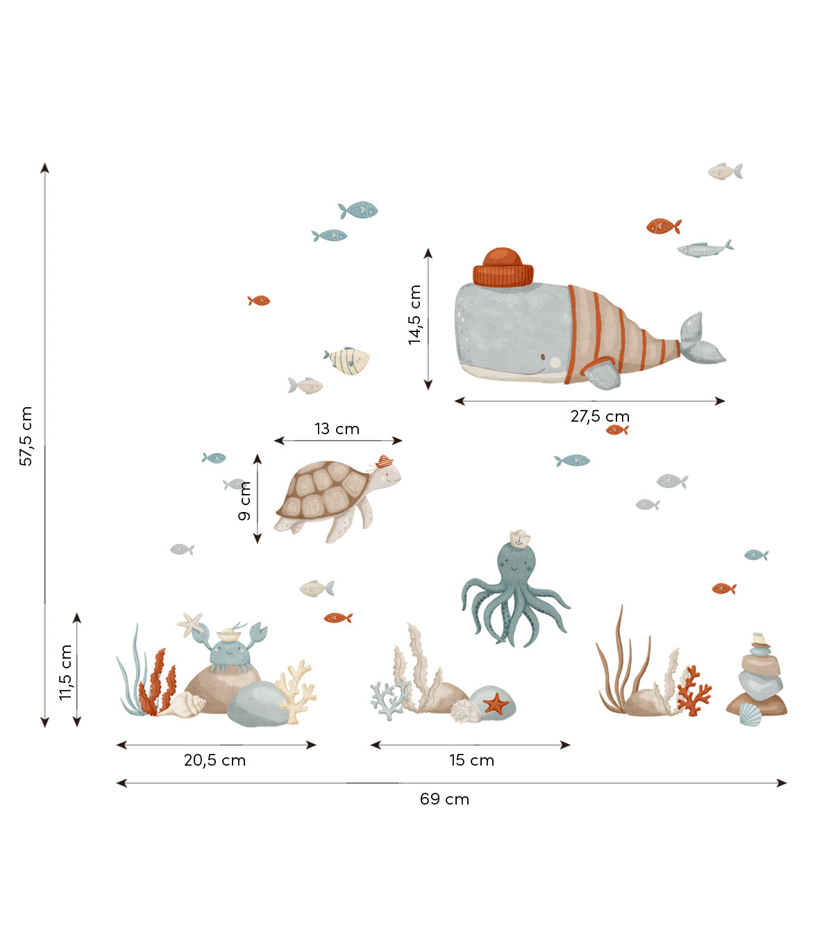A sincere invitation to discover the ocean's mysteries. Little seaside houses, gently sailing boats, and majestic whales wearing little sailor hats create a scene that is both charming and whimsical. Every element, from the joyful baby whales carrying villages on their backs to the laughing little crabs and waving turtles, is designed with an attention to detail that awakens the imagination.