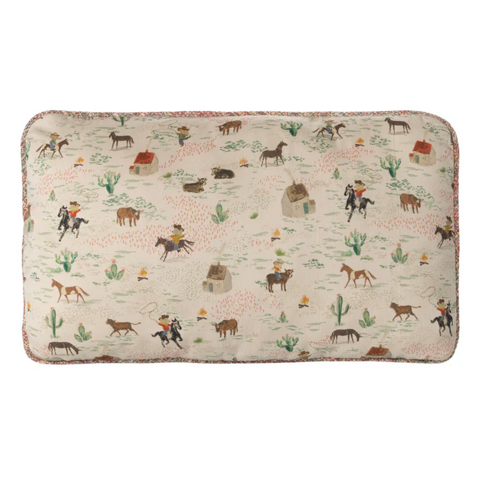 This rectangular cushion comes with the Cowboy print on side and a green checkered print on the other side. Decorative piping has been added around the cushion to complete the look.