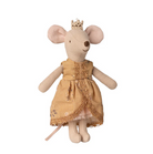 A real princess mouse in a big sister size. She is dressed up in her best dress with beautiful details and a golden crown. She fits perfectly into the Maileg castle.