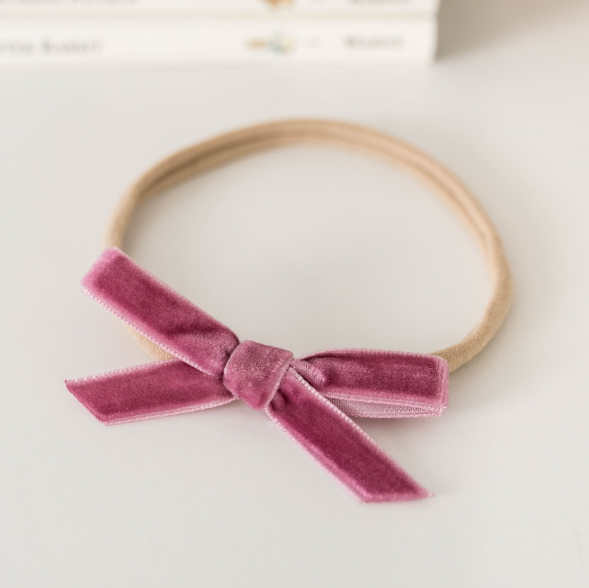 Our petite bow is made from velvet and the headband is made from soft stretch nylon elastic.