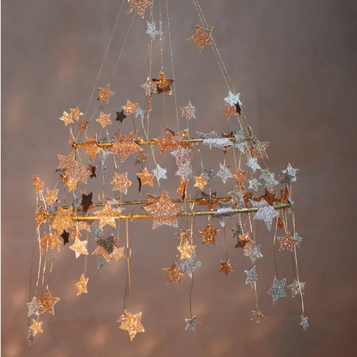 This gorgeous chandelier is a stunning way to add a touch of style to any room. It's beautifully crafted with lots of glittering gold stars with gold wire and thread. Perfect for the holidays, or any time of the year where you want a decoration that is the star attraction!