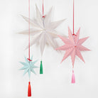 These 3D Christmas star decorations have got it all; color, style and sophistication! Stripes in traditional festive tones team beautifully with bright statement tassels and luxurious red velvet ribbons. Perfect to hang in a porch or window, or from the ceiling, for a vibrant look. Team together, or place separately, to achieve the effect you want. Reusable, bring them out every year for seasonal cheer and elegance.