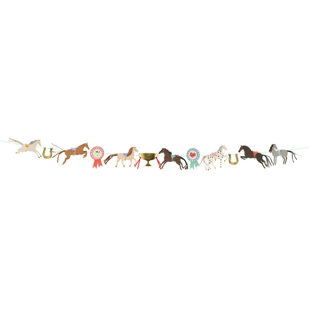 This gorgeous garland will make your guests gallop with glee! The combination of horses, shiny foil horseshoes, a champion cup and colorful rosettes will look perfect on the party table or on the wall. It's also a wonderful decoration for a horse-mad child's bedroom.