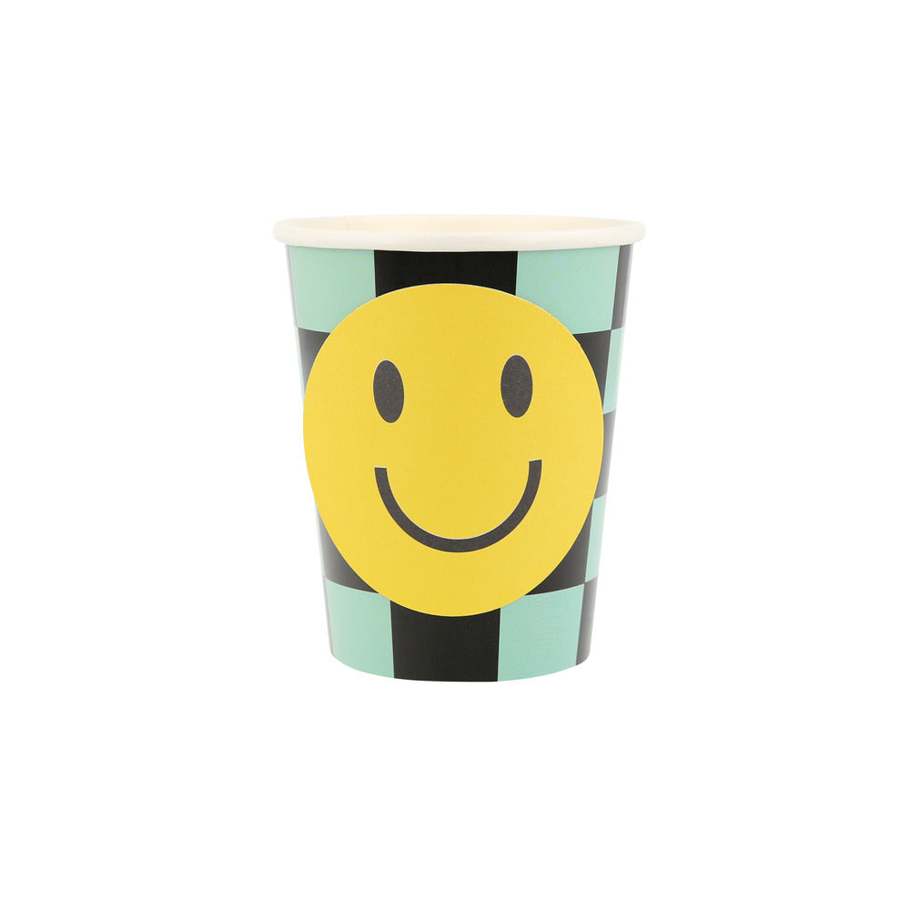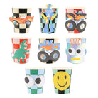 - The checked cups include 8 different printed paper designs, attached to the cups, including monster trucks, a car, a robot, a T-rex, a smiley face and googly eyes