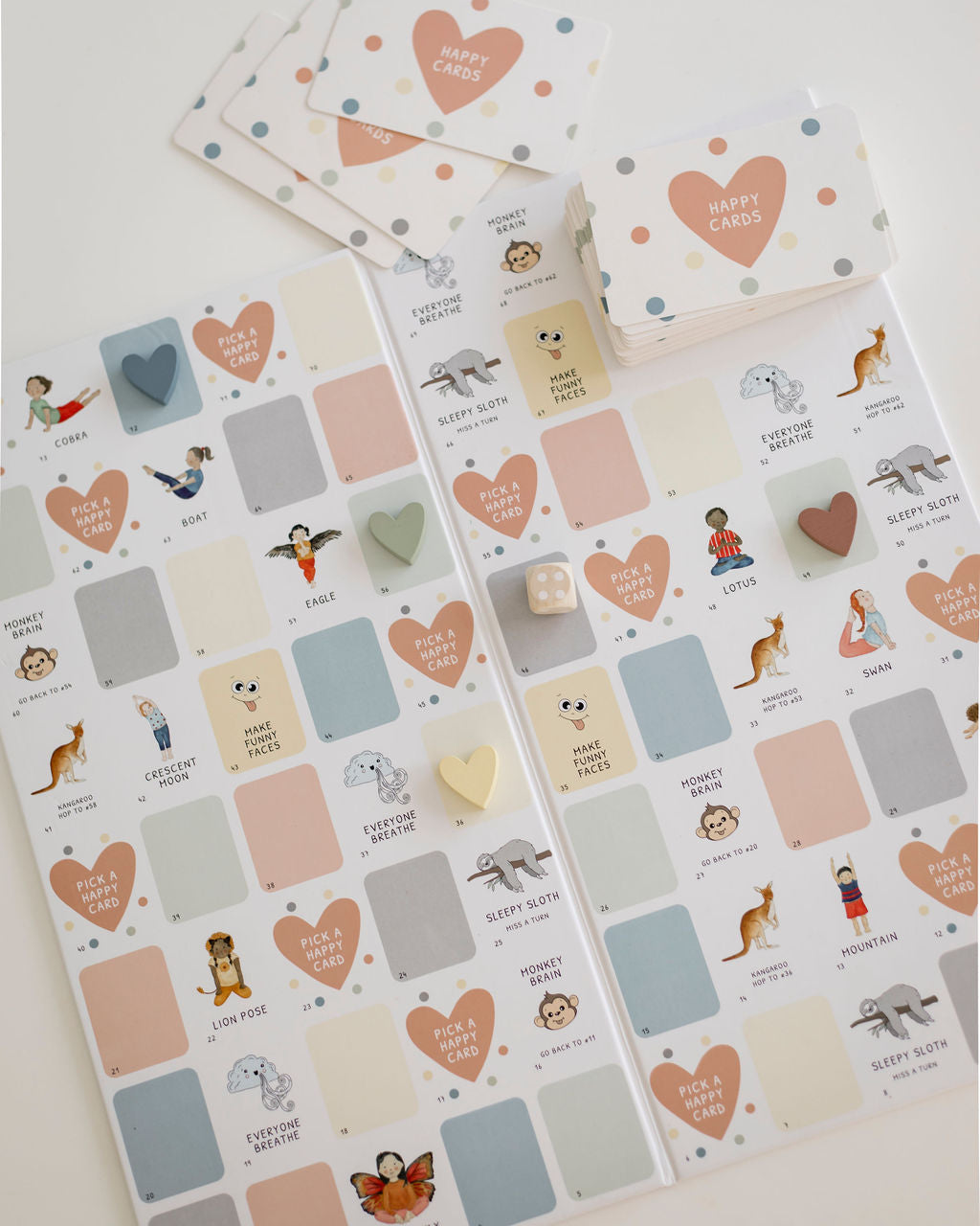 Happy Hearts Board Game weaves science-backed mindfulness techniques - like gratitude and body awareness with yoga and breathing - into a lovingly made, hand-illustrated board game. This board game is designed to develop a growth mindset, ignite laughter and bring joy to playtime.