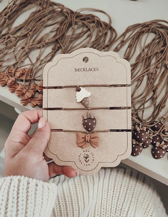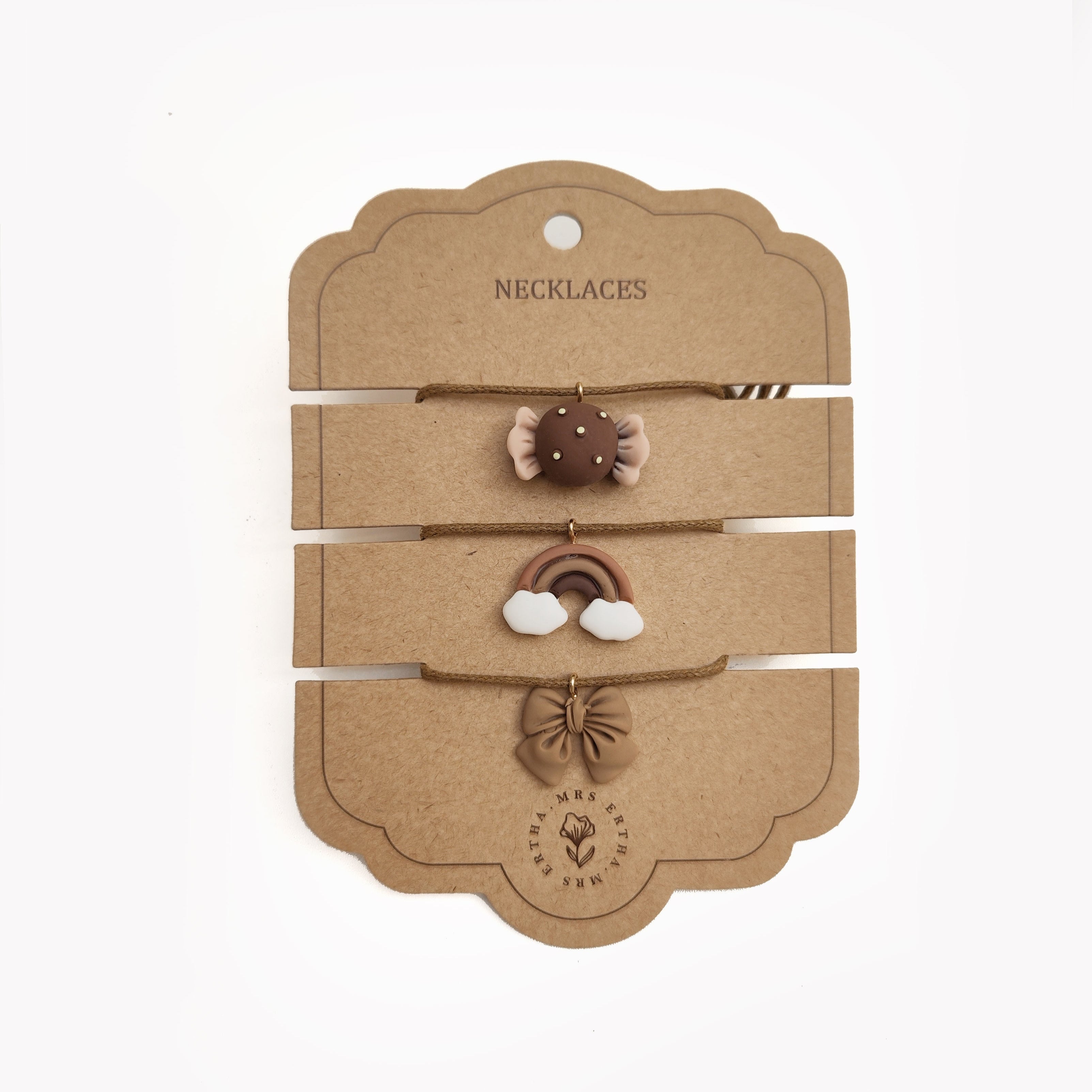 The Mrs Ertha Necklace Set includes 3 decorative necklaces for kids in bow, candy and rainbow designs. Perfect for special occasions or everyday wear.