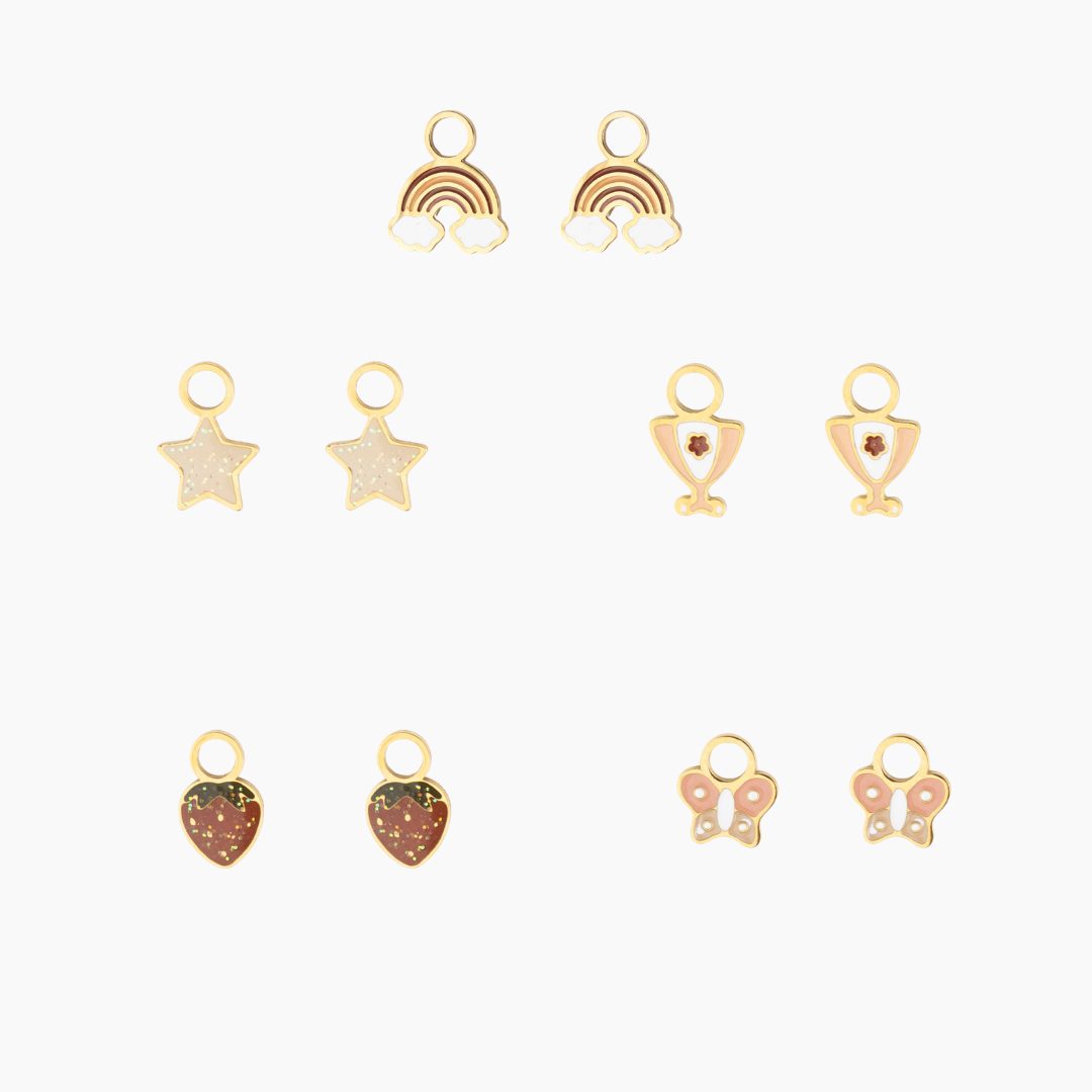 Charms are crafted from durable stainless steel and luxuriously plated in 18k gold, our earrings are made to last. They are hypoallergenic and skin safe for 24/7 wear. With vibrant colors and playful, on-trend designs, they’re absolutely irresistible. kids and teens will love them!