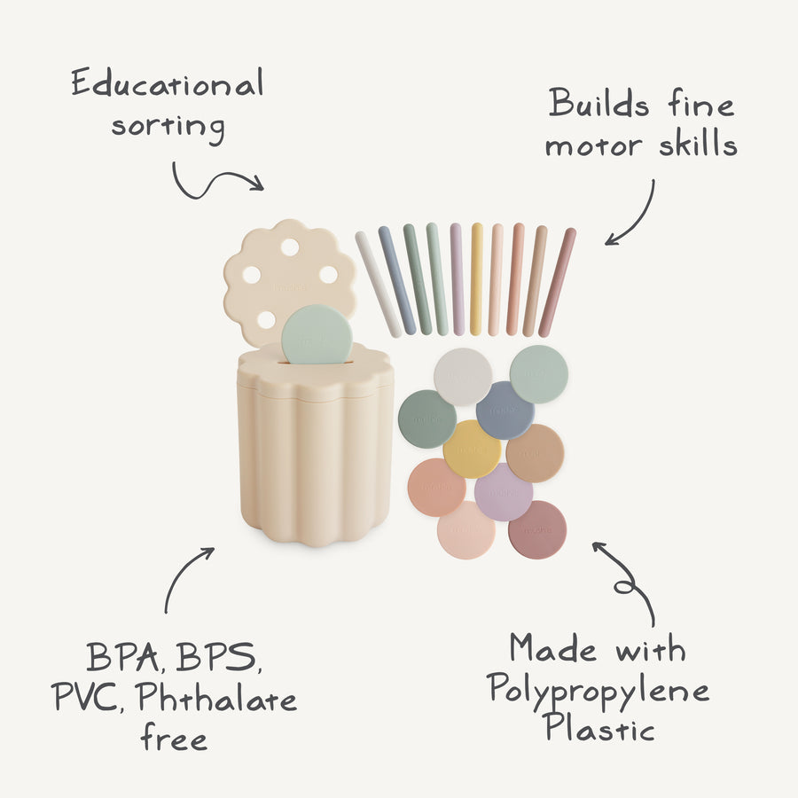 Introduce sorting and matching with our coin & tube sorting box set. The round scalloped box comes with two interchangeable lids and is made of durable PP plastic. As littles fit the 20 colorful coins and tubes through the corresponding openings, they can develop fine motor skills and hand-eye coordination. Whether they're matching or sorting, this versatile toy offers hours of educational play for toddlers.
