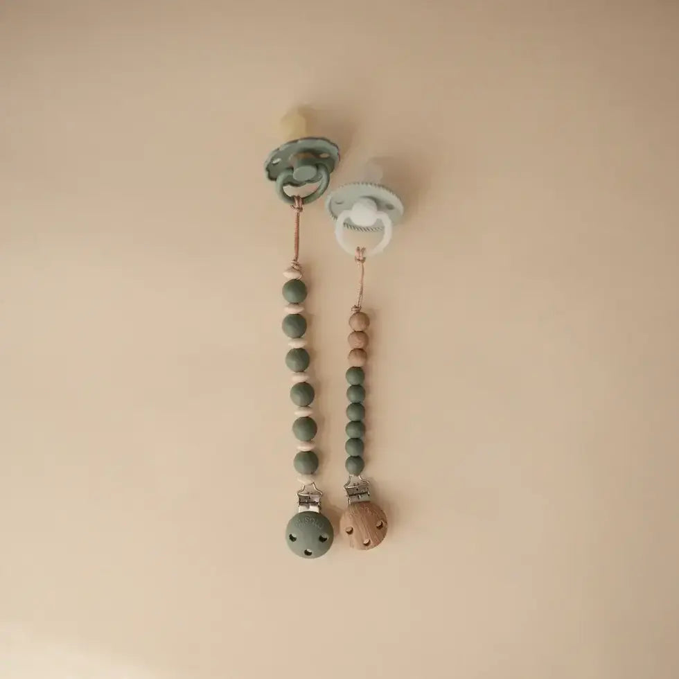 The Mushie silicone pacifier clip offers durability, function and simplicity to families on-the-go. Made from 100% food-grade silicone, our clip features a silicone clasp that brings a modern take to a traditional favorite. With two sizes of beads stacked in a simple pattern, the Luna clip is sure to become a favorite accessory for parents and littles alike. The clip is easy to clean and helps keep soothing items in reach for little ones.
