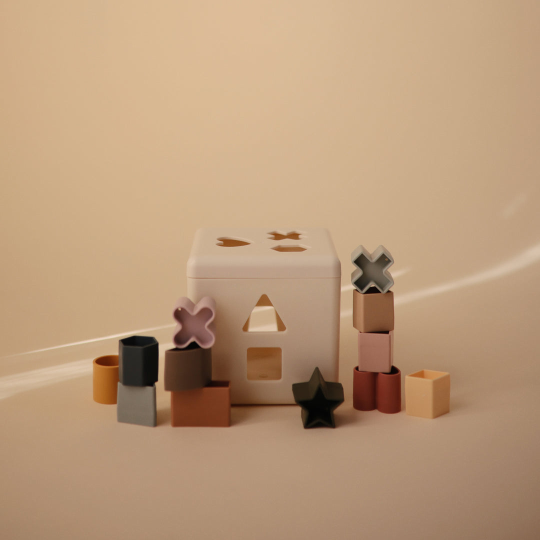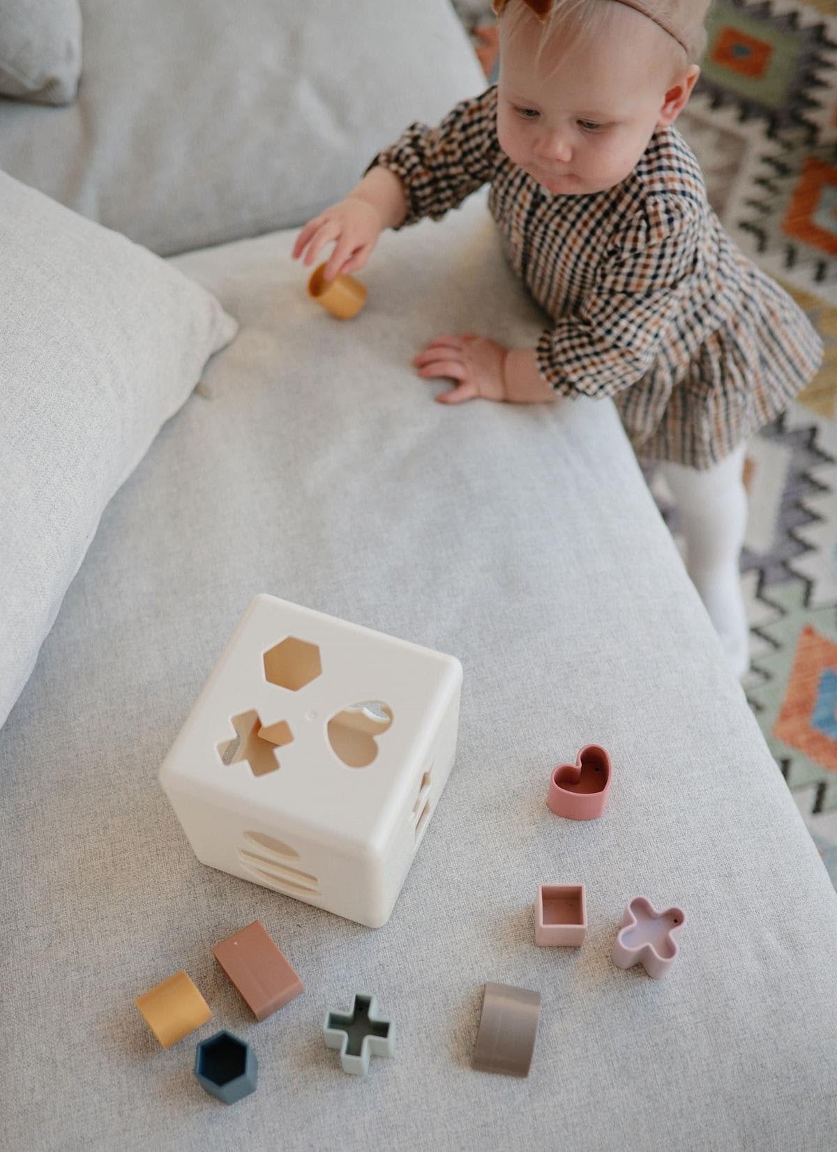 Our shape sorting box is made in Denmark and sets the stage for highly engaged play with endless opportunities for hands-on-learning. Featuring 12 shapes in soft colors, children will expand their fine motor skills as they match shapes to their paired cutouts.