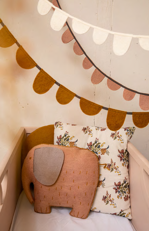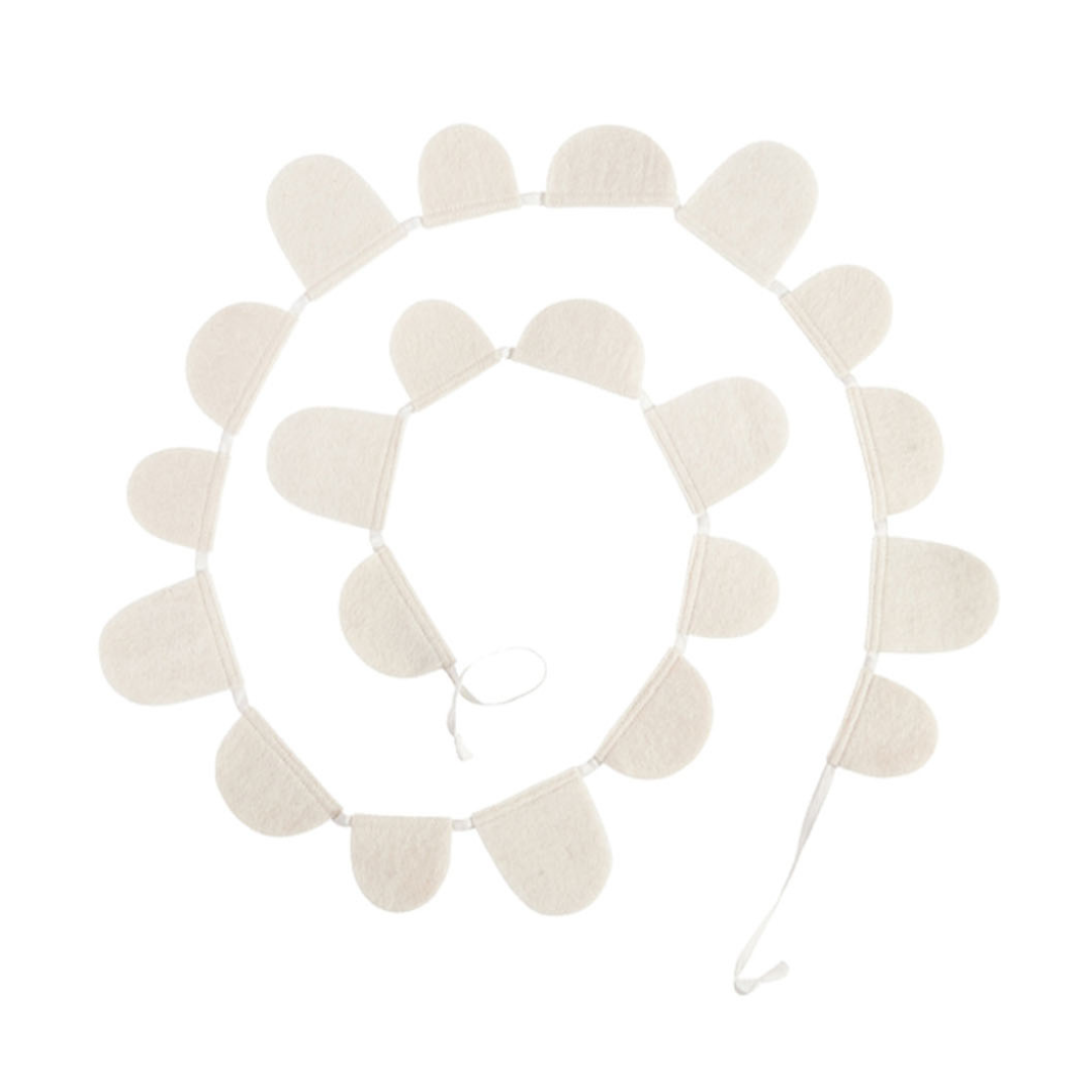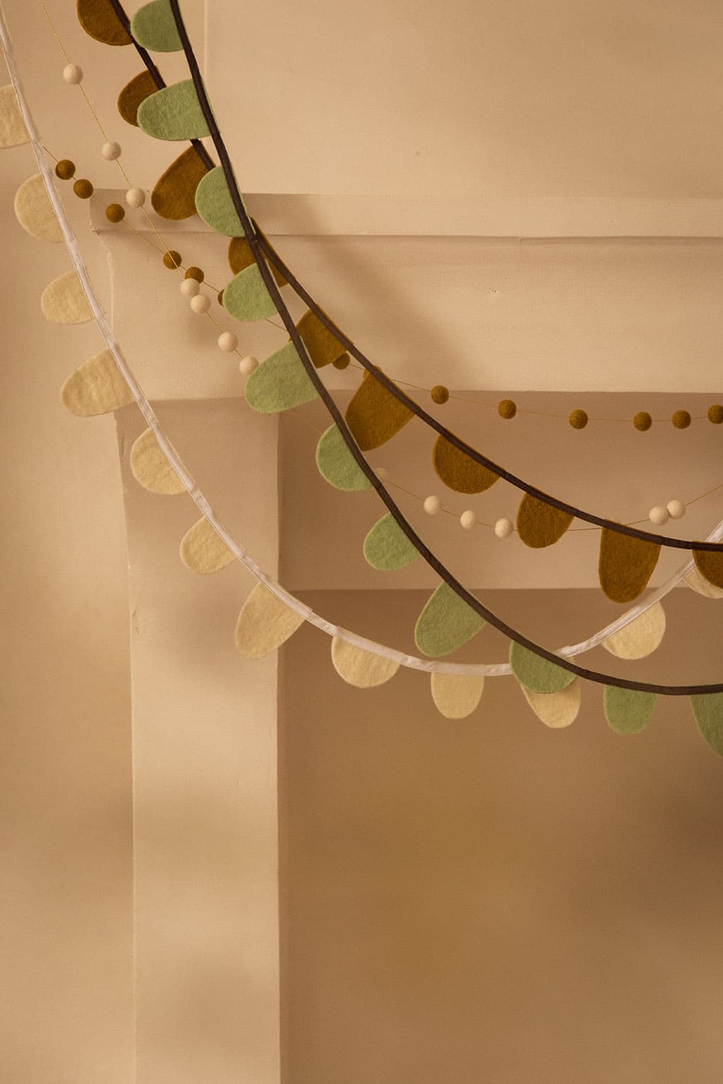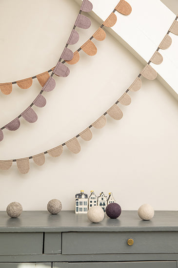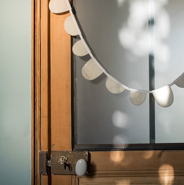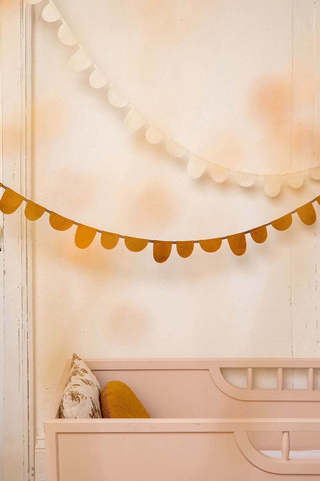 The ROUND FLAGS GARLAND is a kind of fusion between the flags of Buddhist prayers floating in the wind in the Himalayan region, and the festive garlands of our own countries. Attached along a wall, a door, or a baby’s cot, it will lend a sweet breath of elegance and its carefully selected colours will appease the spirit.