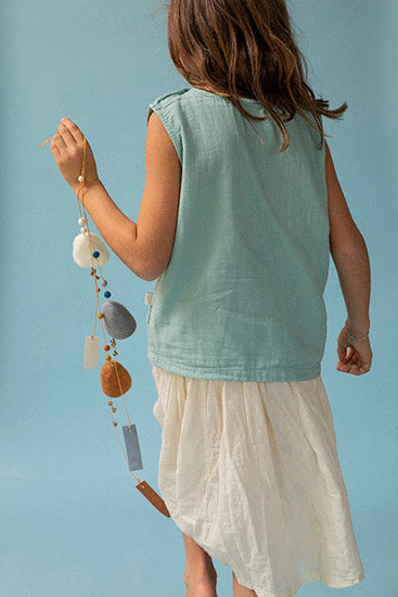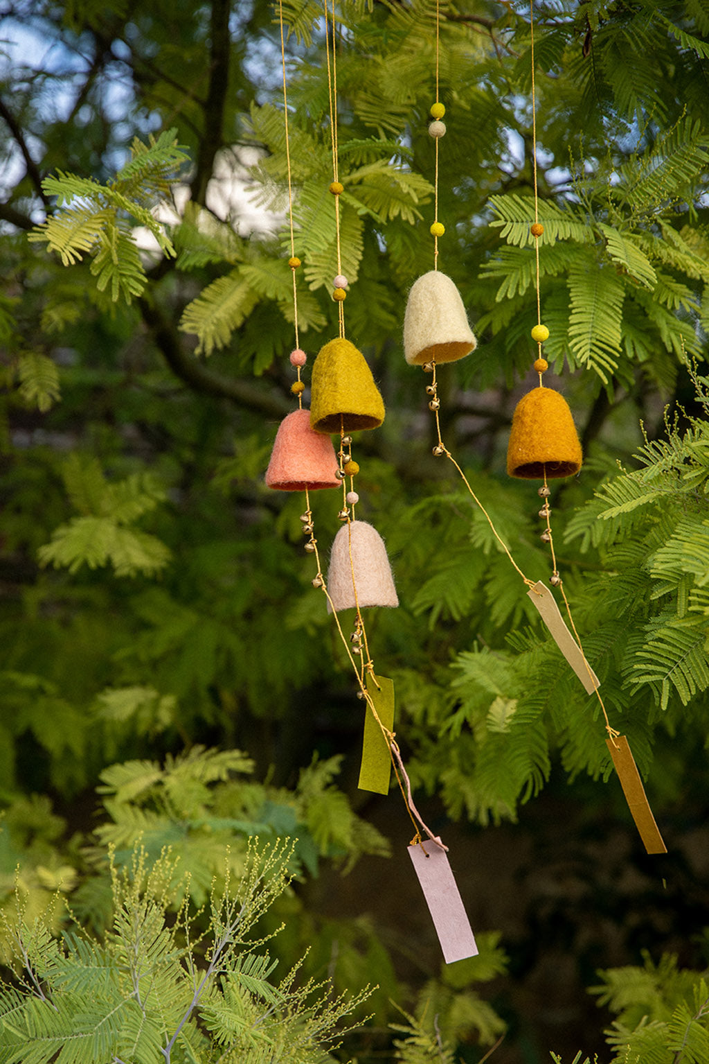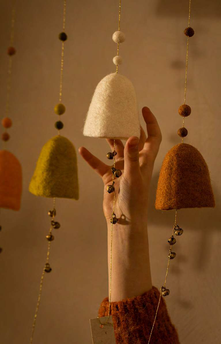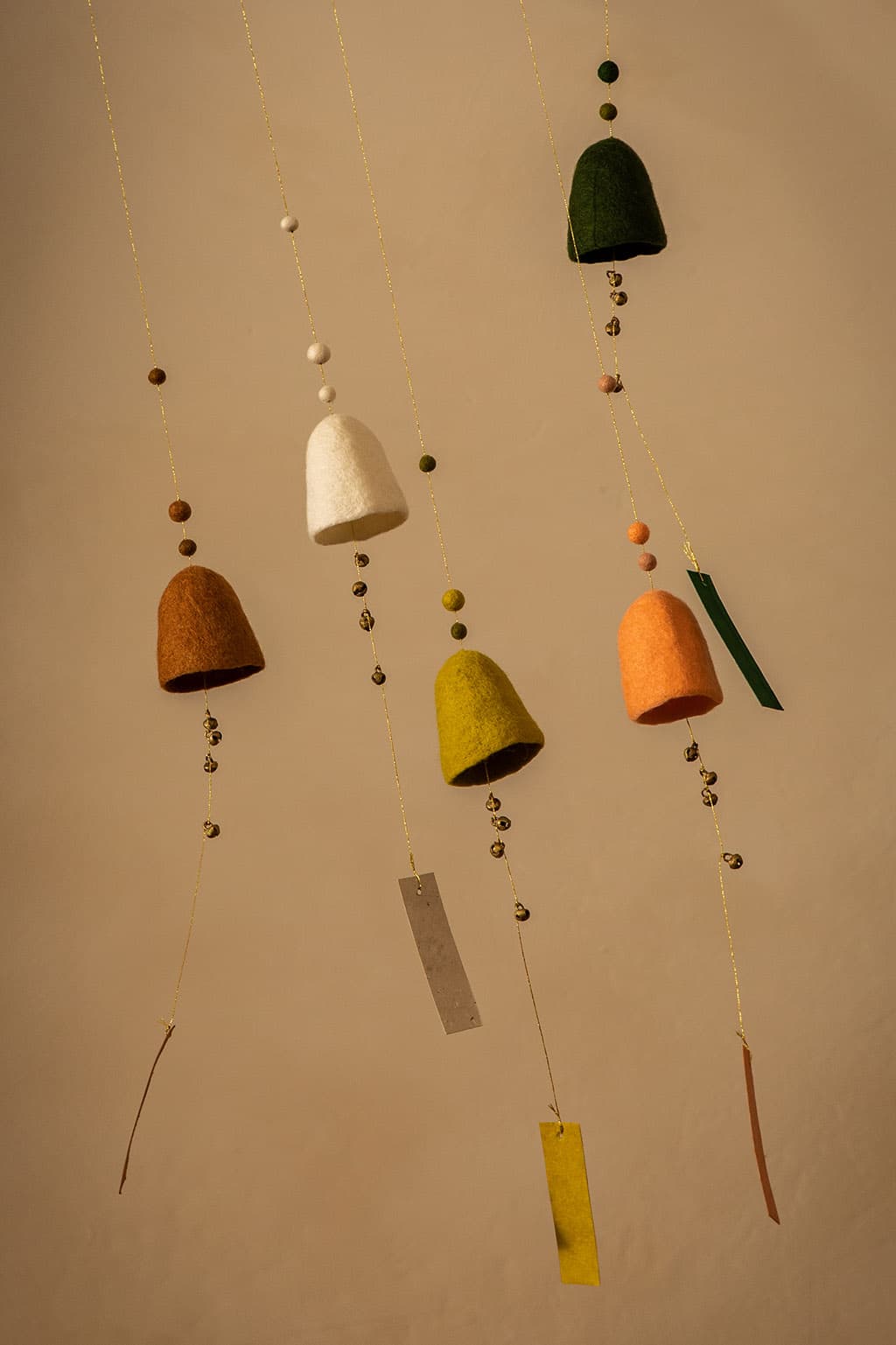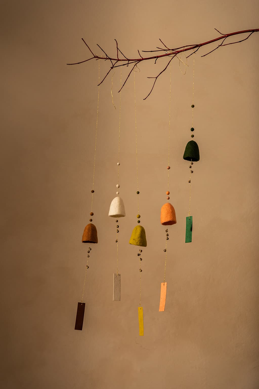 Inspired by the bells of Nepalese temples, MUSKHANE has created its WIND BELL by combining felt, brass bells and Nepalese paper. Entirely handmade in our workshops, this pairing of materials creates a decorative and poetic accessory that will radiate throughout the room you hang it in!