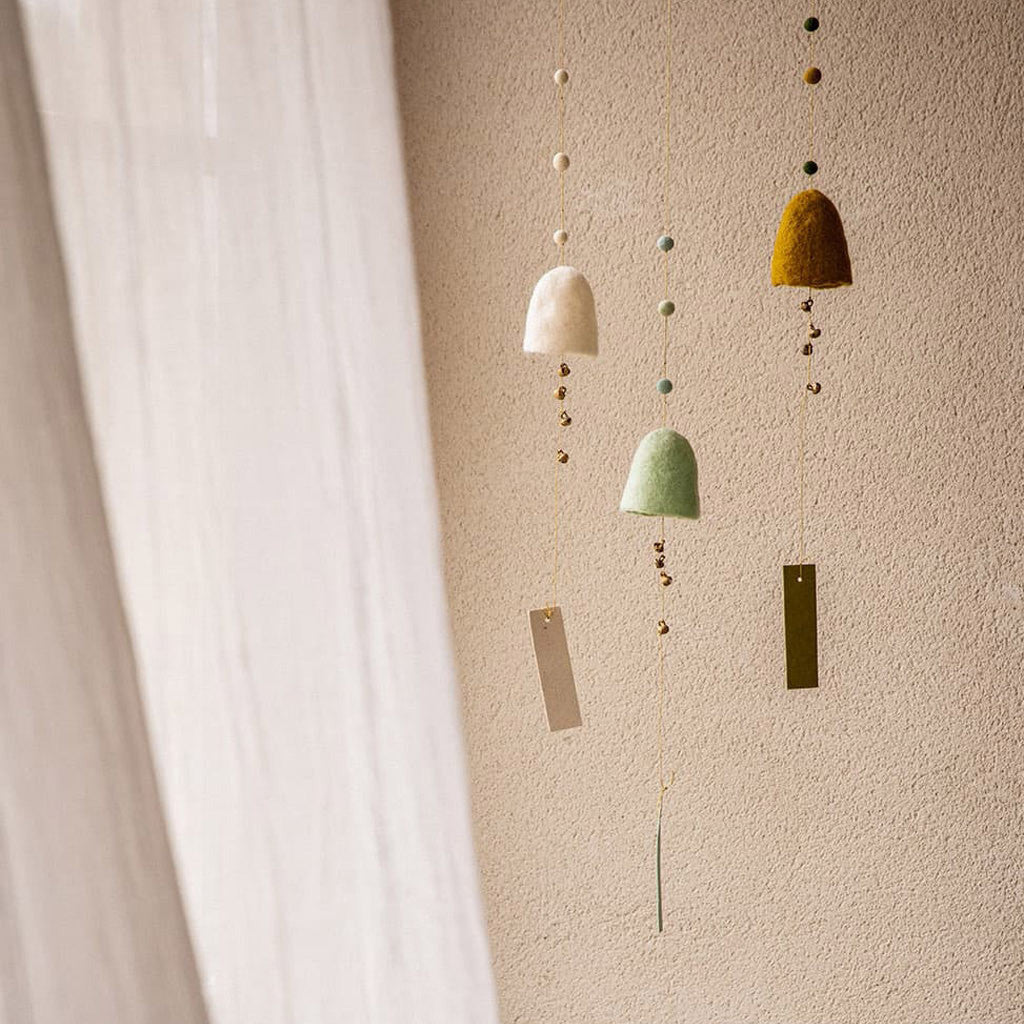 Inspired by the bells of Nepalese temples, MUSKHANE has created its WIND BELL by combining felt, brass bells and Nepalese paper. Entirely handmade in our workshops, this pairing of materials creates a decorative and poetic accessory that will radiate throughout the room you hang it in!