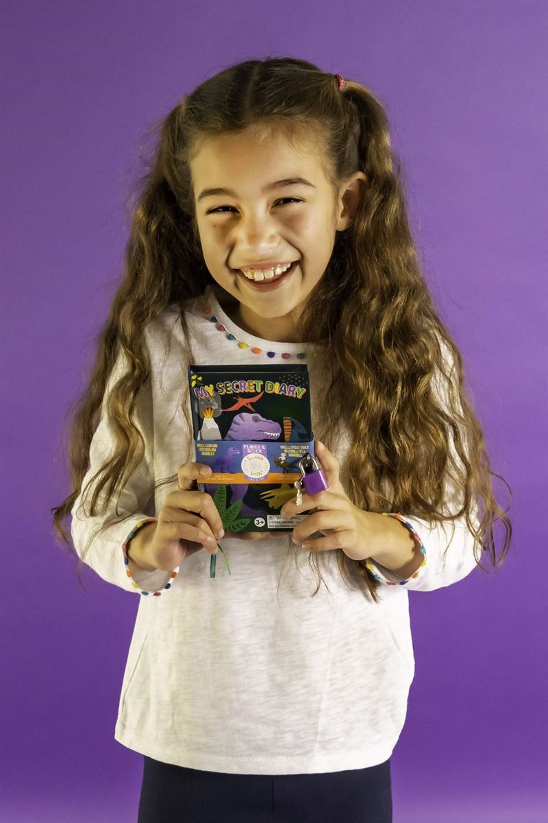 Wow…a SCENTED and SECRET diary. This Dinosaur themed secret diary smells of Cola. Simply scratch the cover and you will reveal the scent. Includes a padlock and key AND a fun shaped sticker sheet with Dinosaurs, Cave People and much more. There are multi colour ribbon page holders too. Pages are lined. Perfect for travel and taking out and about.