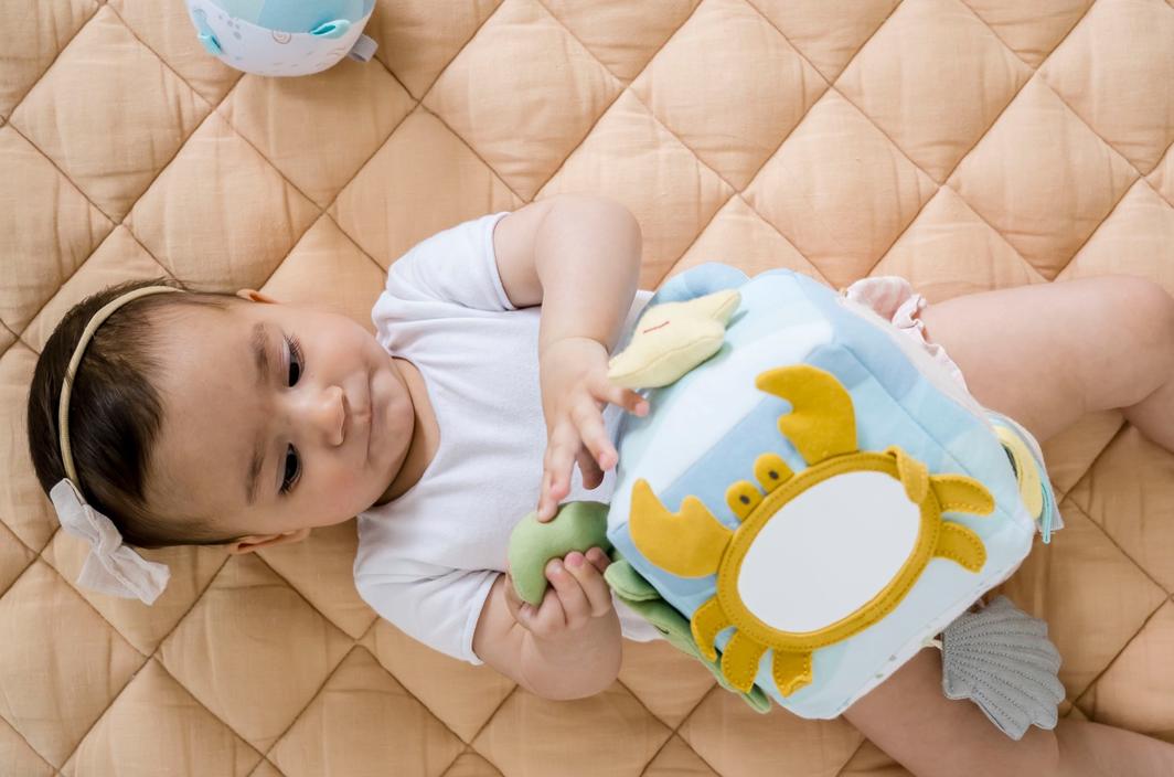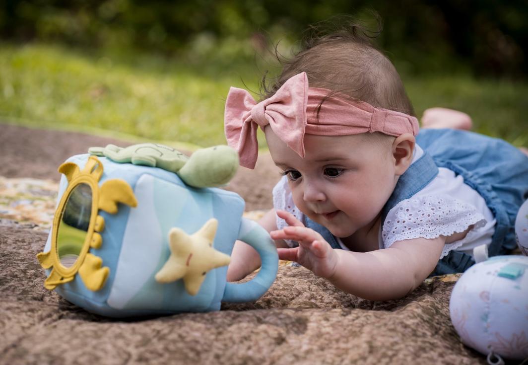This soft little Organic Activity Cube with ocean animals contains many activities that stimulate the baby’s senses. There is so much to discover and play with: different textures, a mirror, rattle & squeaker make sounds with every movement. There is also a small turtle that likes to play by pulling his tail. This toy remains interesting and ensures fun times.