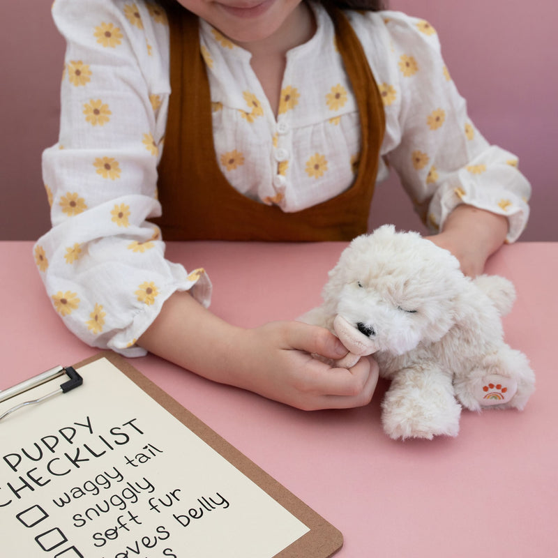 Introducing Binky Puppy Belle, your Dinkum Dog’s mini sidekick! With irresistibly soft, shaggy plush fur and a gently weighted, posable body, Belle is perfect for both cuddles and endless play. With just as much charm and fun as our Original Dinkum Dogs the Binky Puppies are their smaller counterpart, ready to adventure with your little one anywhere and everywhere!