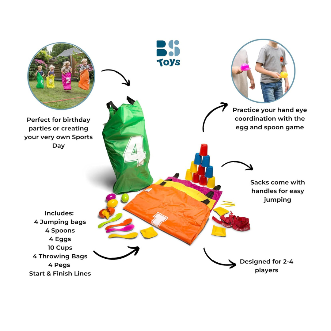 4 jumping bags 70 x 50 cm 4 spoons & 4 eggs 10 cups 4 throwing bags 4 pegs Start and finish line Created from eco friendly, recycled materials.