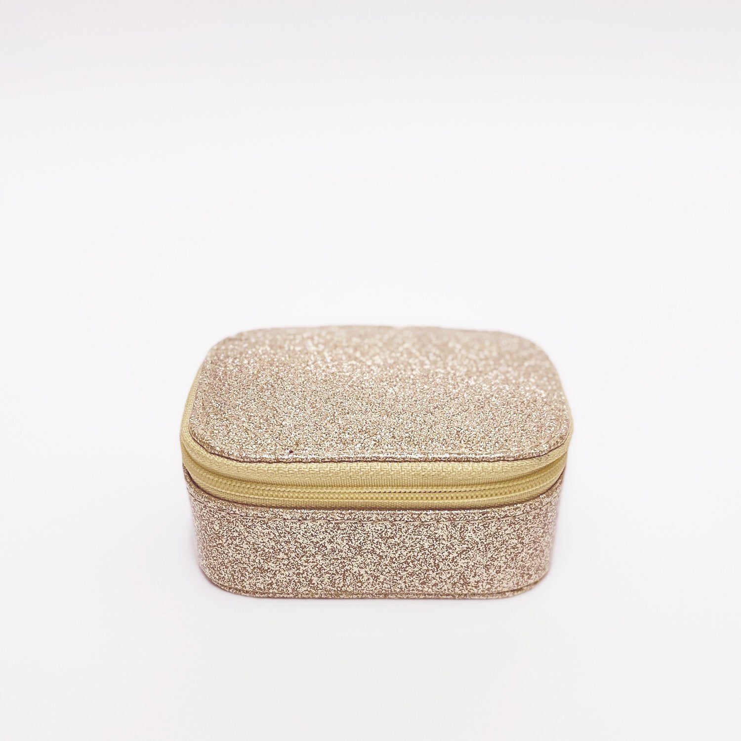 Featuring a non-shedding glitter fabric, this jewellery box has a zip fastening to reveal a compartment, a slip pocket and a dedicated space to slot earrings and rings.