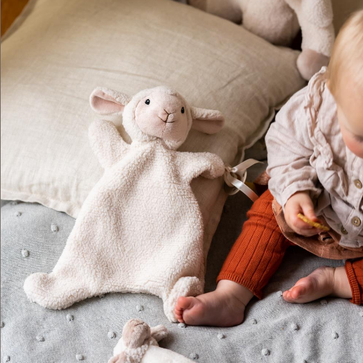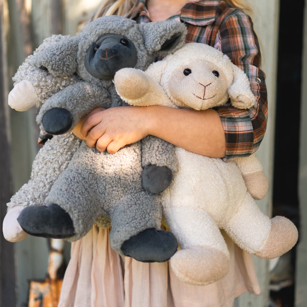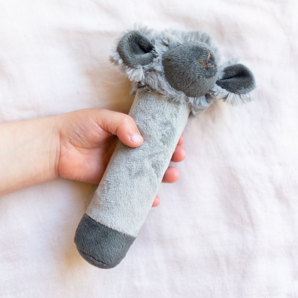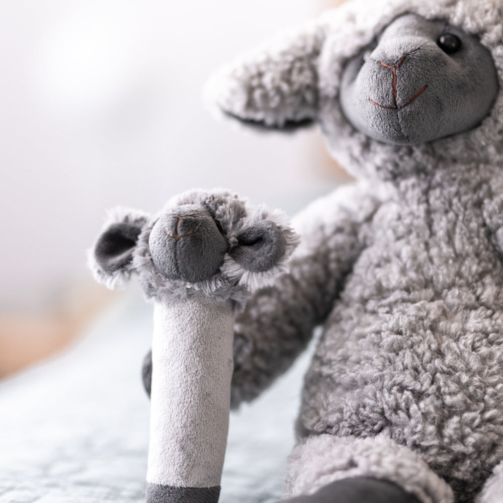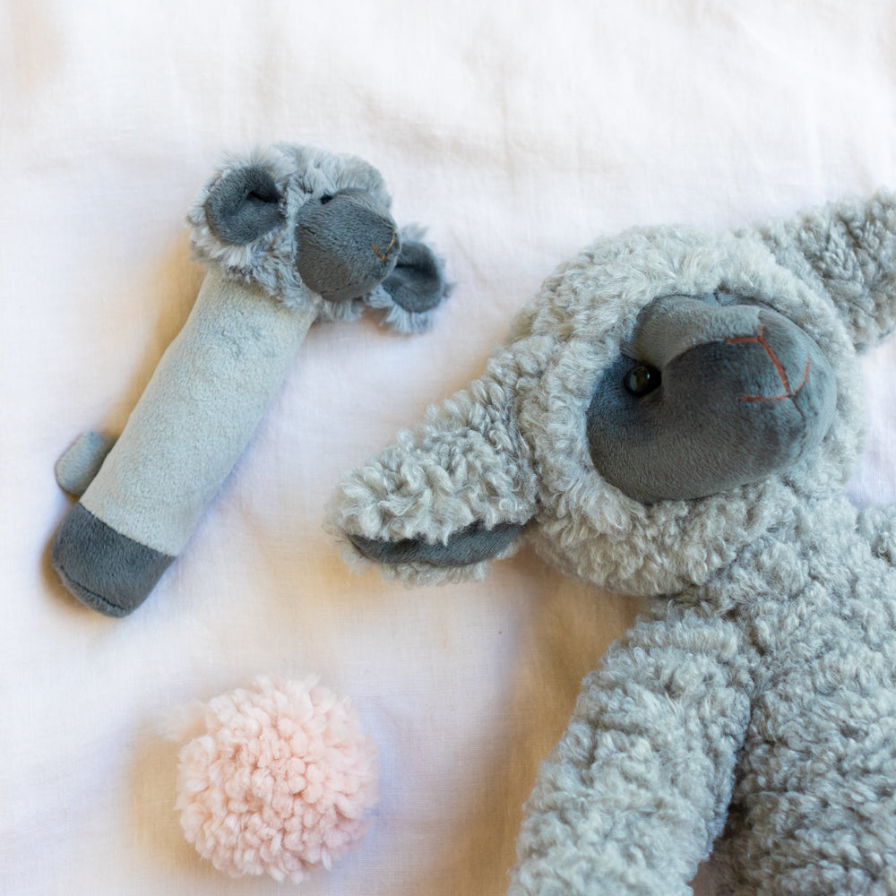 Sammy the Sheep was an unusual sheep from birth, because he always slept on his back and often napped during the daytime. It may have been a consequence of his massive appetite (he covers the farm’s largest paddock in under an hour). While hand squeaker toys have limited squeaks, this gorgeous baby rattle will never run out of rattle! And unlike squeakers, there's no toddler strength needed to produce the desired sound: babies will enjoy rattling these little softies as gently as they please.
