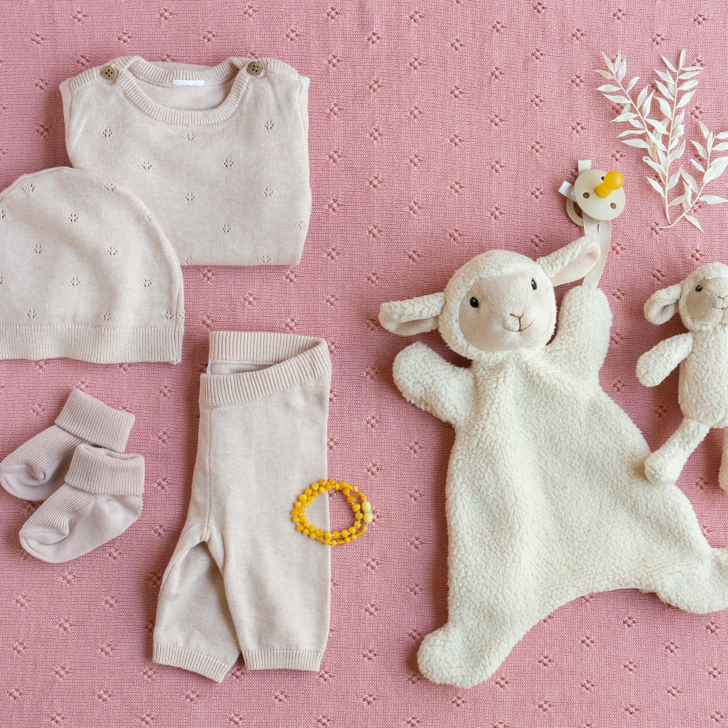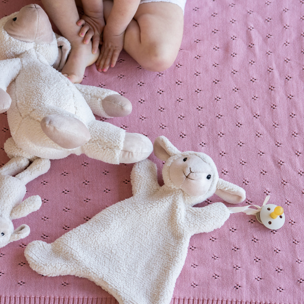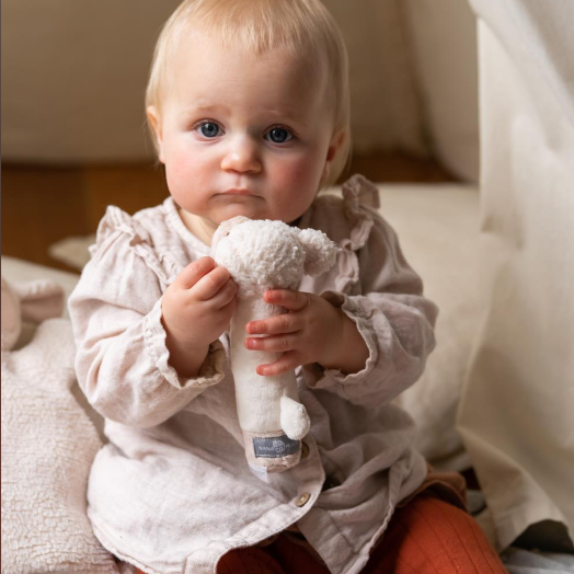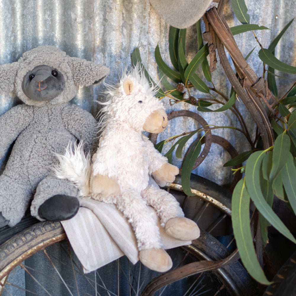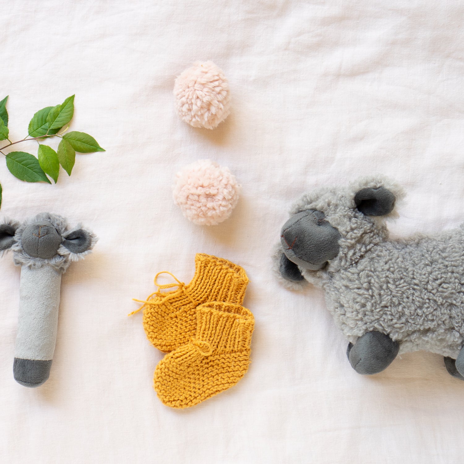 Sammy the Sheep was an unusual sheep from birth, because he always slept on his back and often napped during the daytime. It may have been a consequence of his massive appetite (he covers the farm’s largest paddock in under an hour). While hand squeaker toys have limited squeaks, this gorgeous baby rattle will never run out of rattle! And unlike squeakers, there's no toddler strength needed to produce the desired sound: babies will enjoy rattling these little softies as gently as they please.