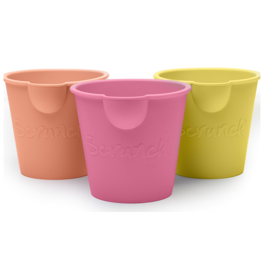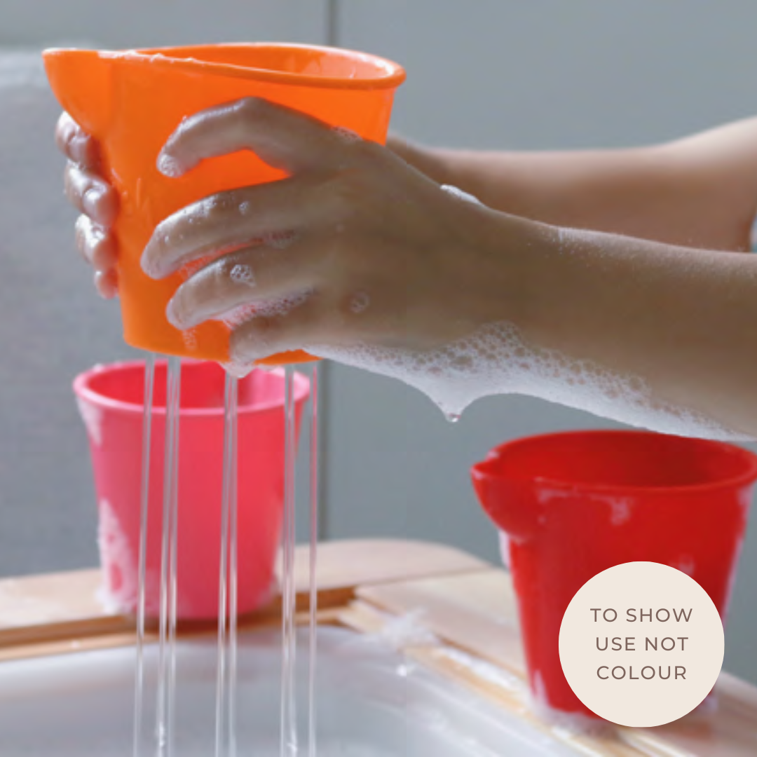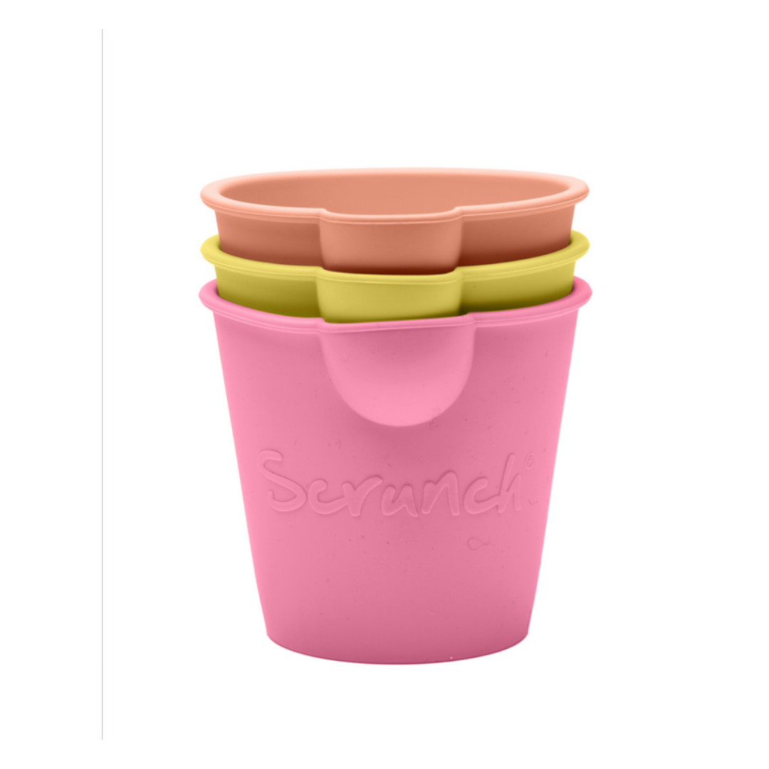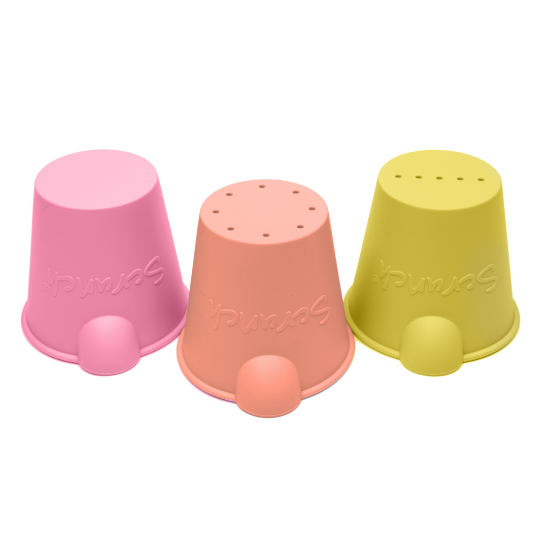 A set of three mini bath buckets with pouring holes from Scrunch Kids. These soft, flexible silicone pourers are perfect for little hands and ready for water play in the bath, pool, garden and at the beach.
