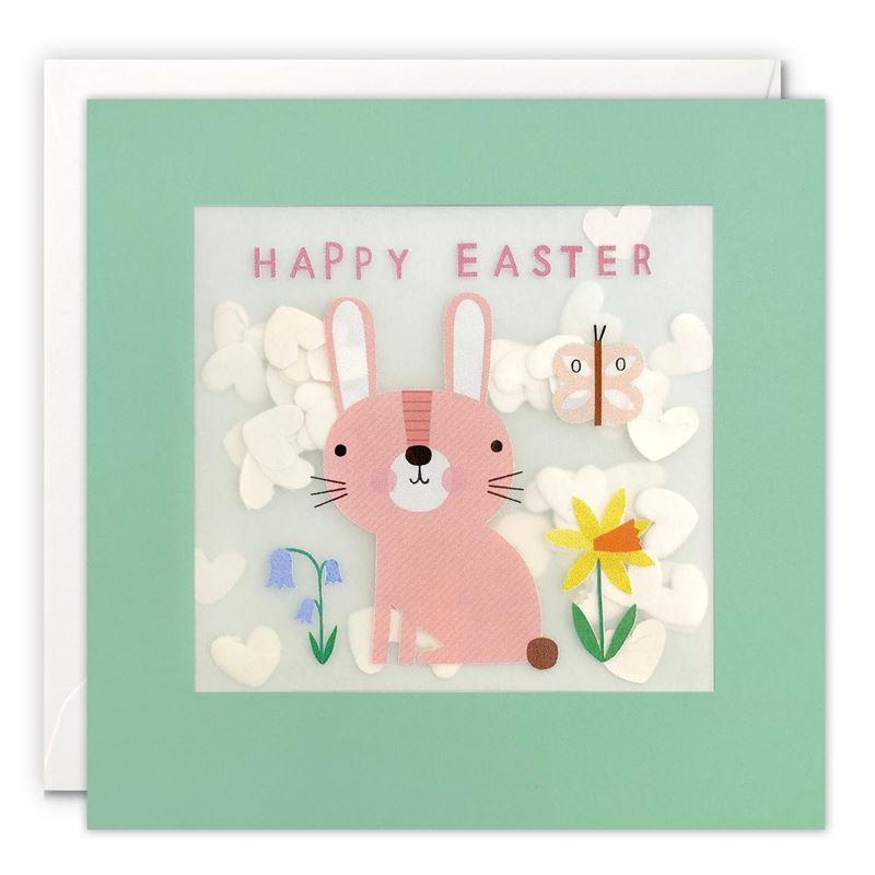 A hand finished Easter card illustrated by Sally Payne. The image on the front features a pink bunny rabbit, a butterfly and flowers.
