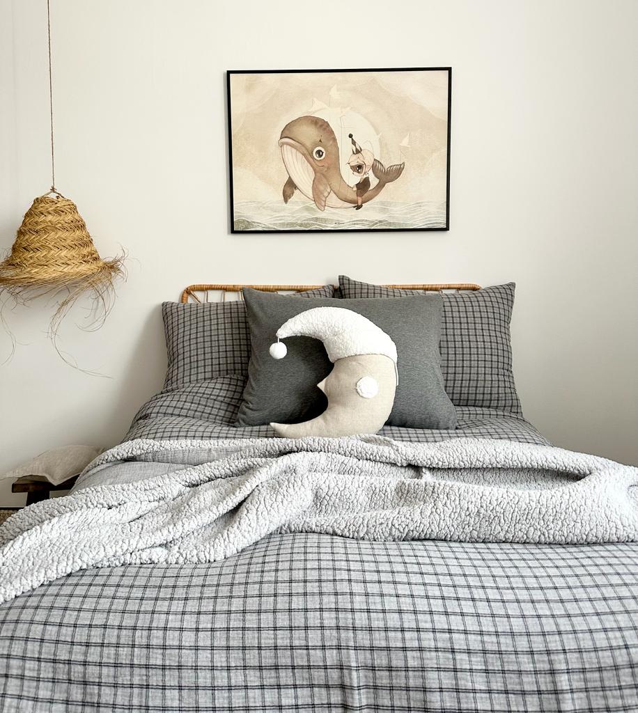The sleeping moon pillow is made of premium fabric - mix of cotton and linen . A charming addition is a boucle hat and hand-embroidered sleeping eyes and a mouth.
