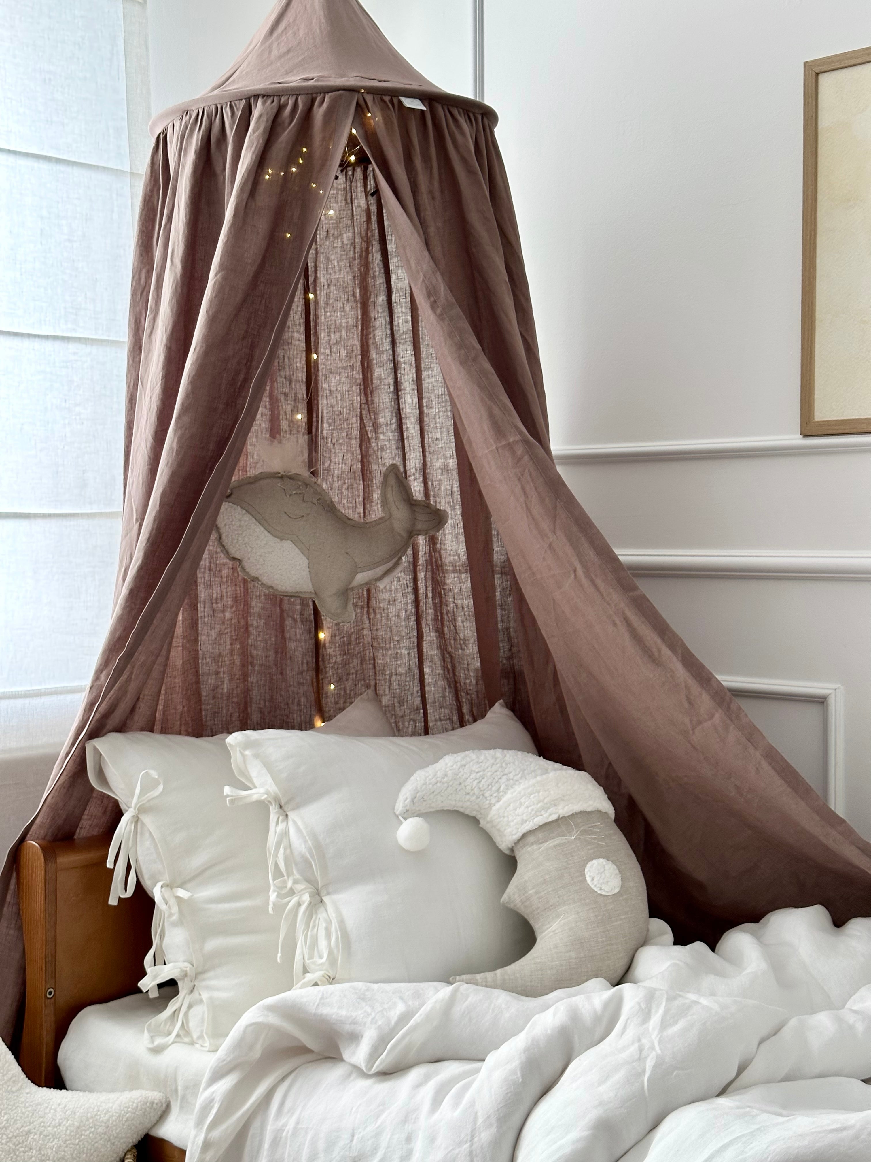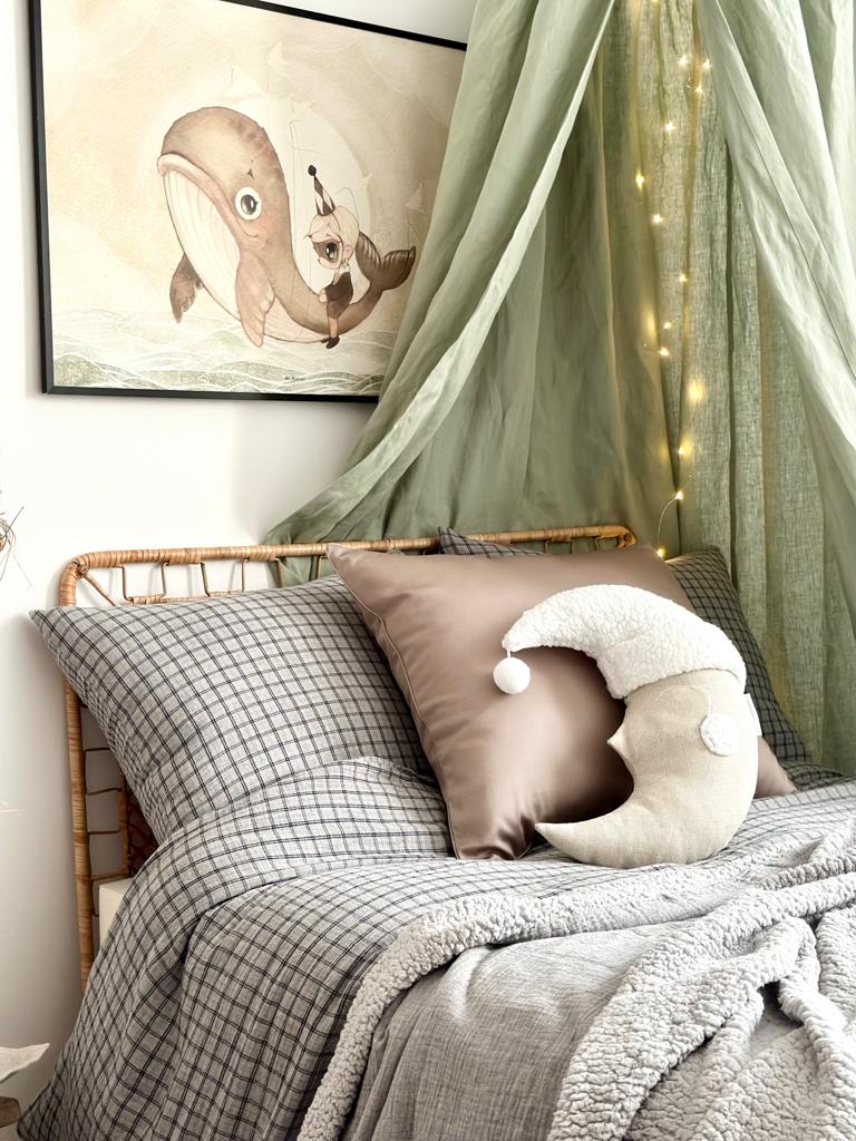 The Sleeping Moon pillow in natural linen is an element of the decor of a children's room, which will bring a fairy-tale atmosphere to the interior as if by means of a magic wand.