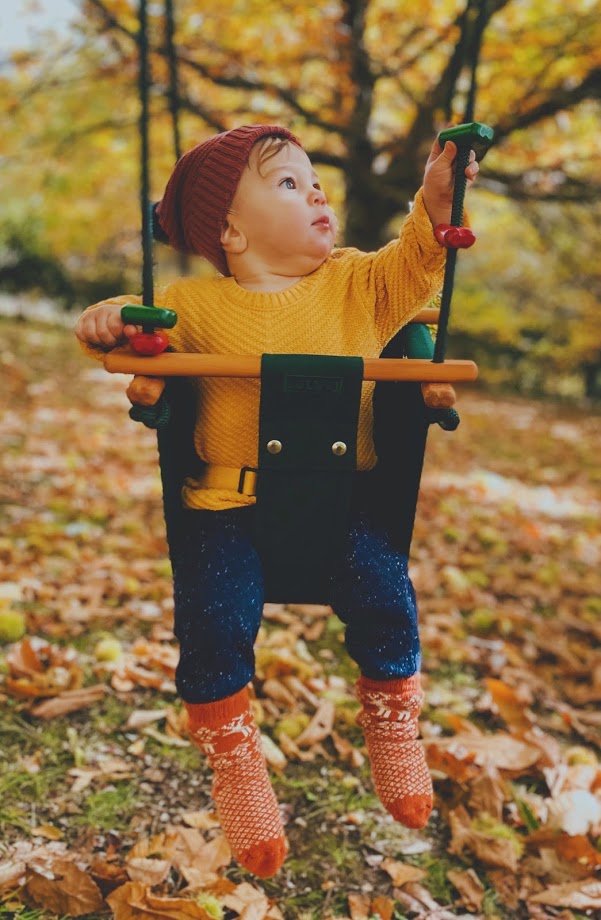 When your child is over the age of 3 the baby and toddler swing can be converted to a toddler version by undoing the leg divider and doming it around the strap under the swing (see picture). adjust the height with the sliding rope-locks so the swing will hang 350-450 mm/14"-18" above the floor or ground. This enables your child to get in unaided by sliding the front bar up, sitting in and sliding the bar down again.