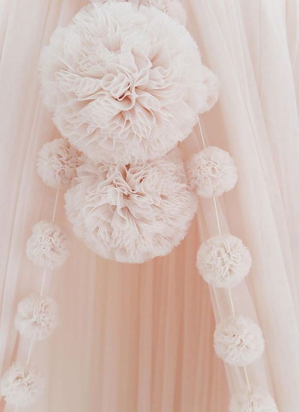 Our Pom Garland is made of soft tulle and measures 5.5 inches/14cm in diameter with a length of 42 inches/107cm from end to end.