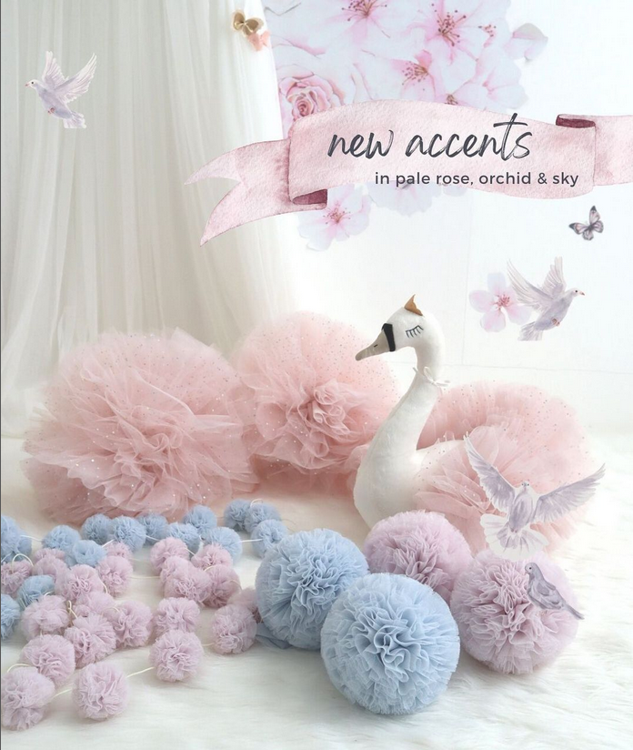Our Pom Garland is made of soft tulle and measures 5.5 inches/14cm in diameter with a length of 42 inches/107cm from end to end.