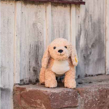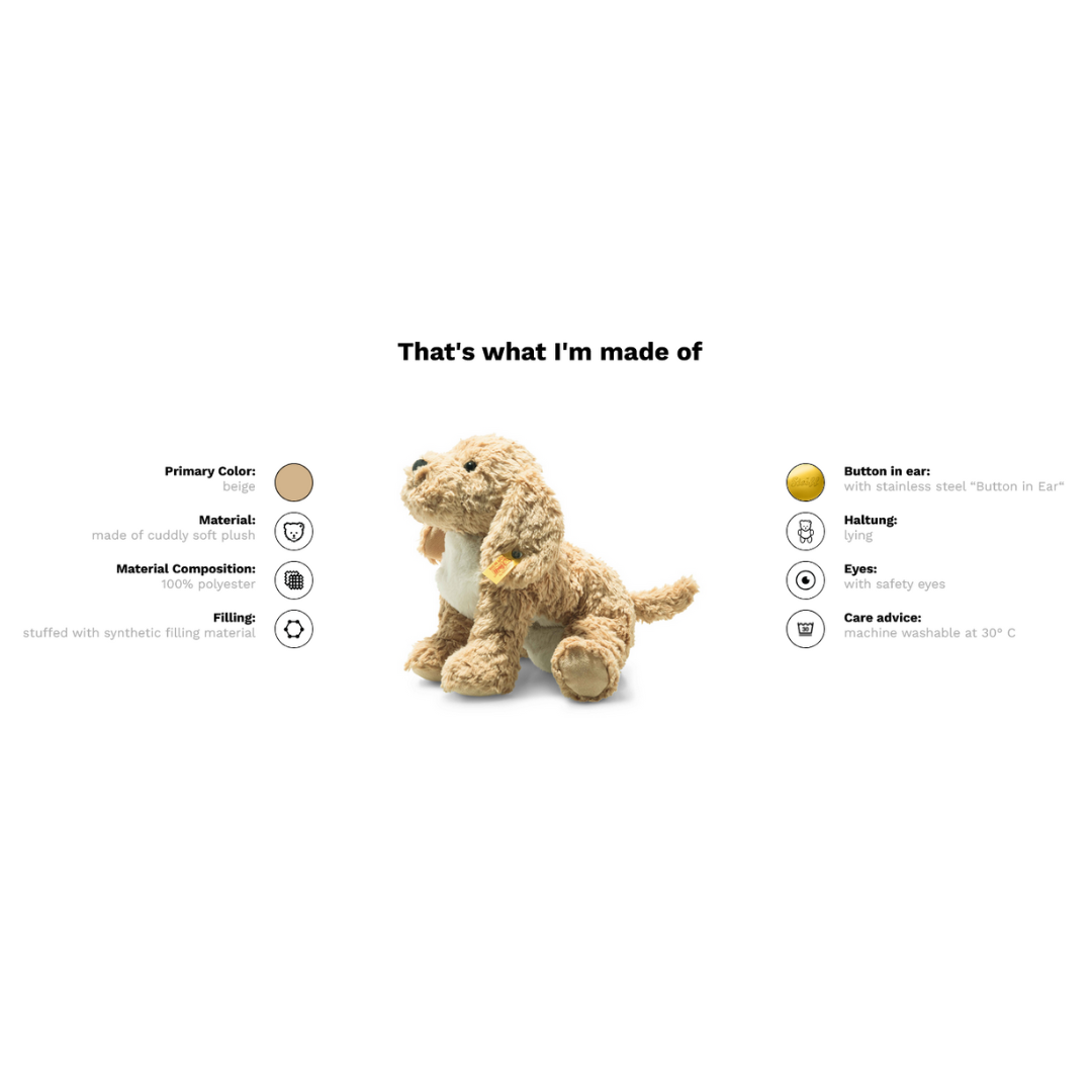 Measuring 26 cm tall, Steiff Berno Goldendoodle comes in a lying-down position with a slightly curly, beige-coloured plush coat resembling that of a Golden Retriever and Poodle. His white, smooth plush chest and tummy offer a lovely contrast. As both his middle and his distinctive brown plush paws are padded with little bean bags, Berno Goldendoodle always keeps his shape. His slightly curved tail completes the look perfectly, and his magnificent floppy ears are crying out to be fondled. And when he plays, they flap around impressively in the air!