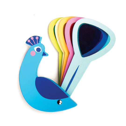 See the world in different colors, or mix the colors to create as many color combinations as you like! This peacock has 5 tail feathers with colored acrylic windows and they can be opened and closed like a real peacock. A great toy for children to learn about colors and color mixing.