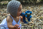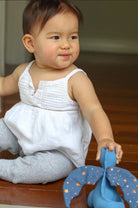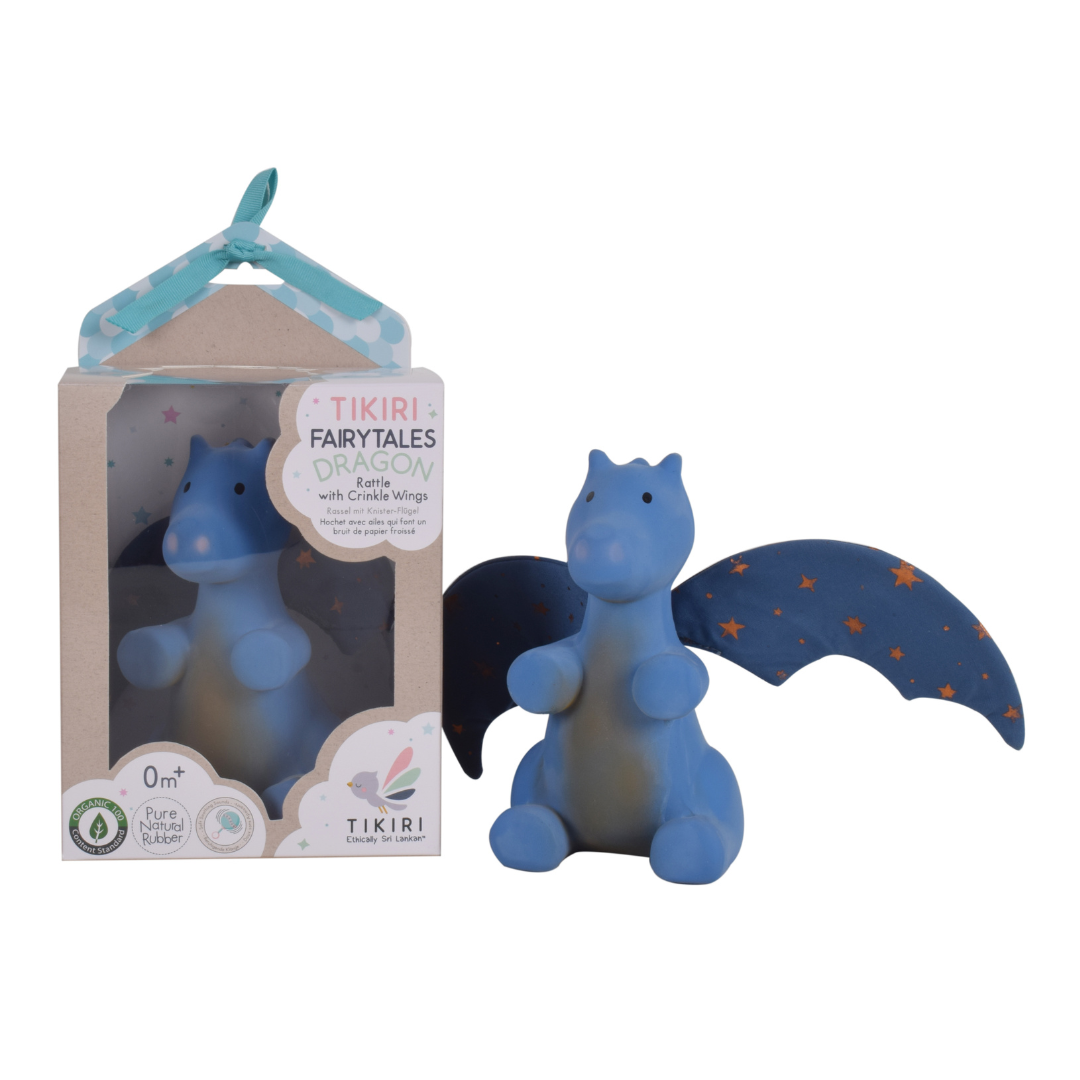 The Baby Midnight Dragon Rattle from our Fairytales Collection is a magical teething companion for babies. Made from GOLS-certified natural latex and hand-painted with soy-based ink, it's easy for tiny hands to grip and combines soft and firm parts to soothe irritated gums. Its crinkly organic cotton wings add sensory fun, while the toy is crafted sustainably, biodegradable, and with socially responsible practices.