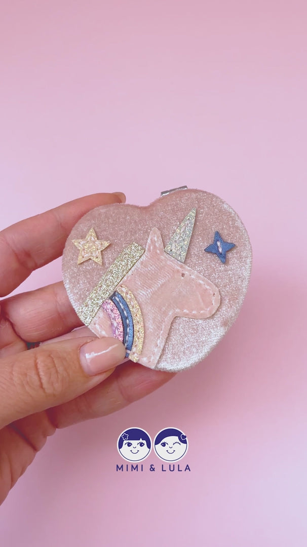 Make every glance magical with this heart-shaped pocket mirror! Covered in super soft, pink glitter fabric featuring a sweet and sparkly unicorn design, it’s perfect for little ones who love a touch of sparkle and fun on the go.