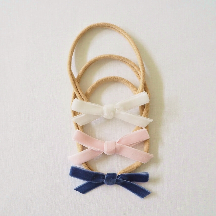 Our petite bow is made from velvet and the headband is made from soft stretch nylon elastic.