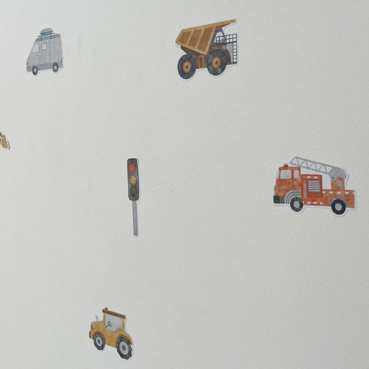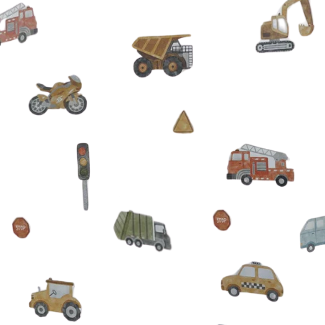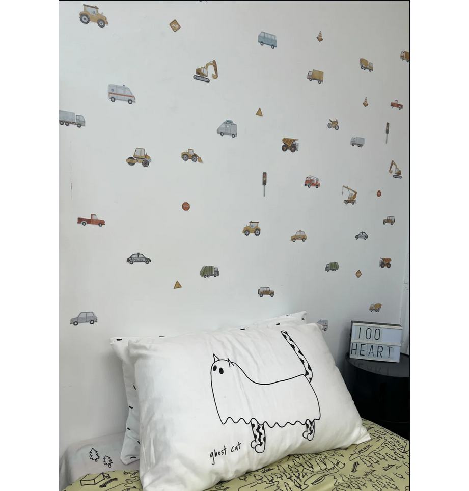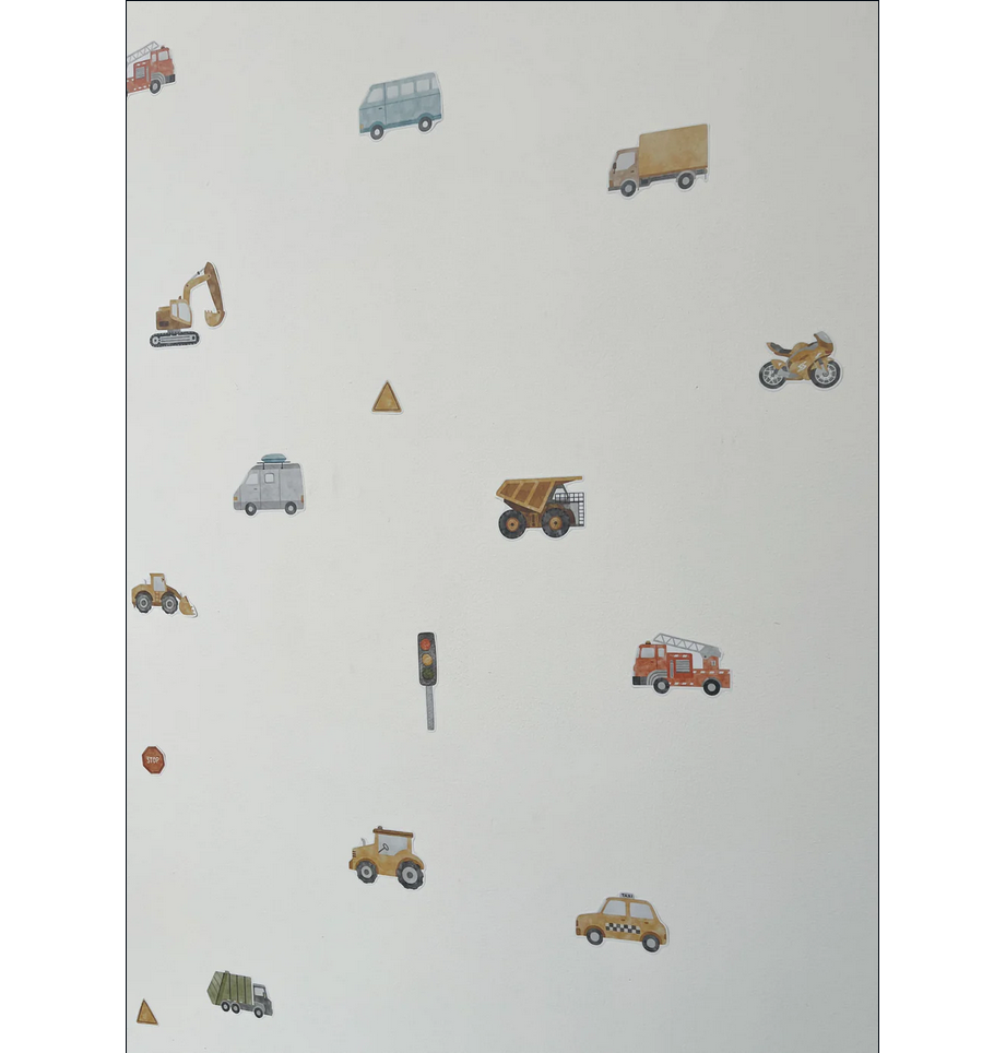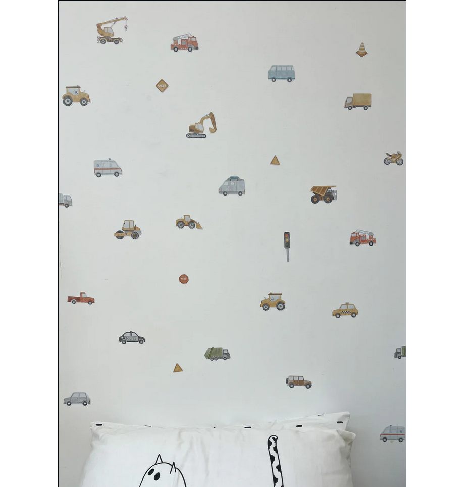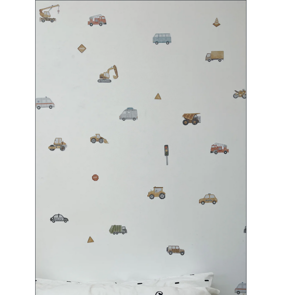 Transform your child's bedroom into a whimsical wonderland with our adorable fabric wall stickers featuring watercolour illustrations of cars, construction vehicles, and more!