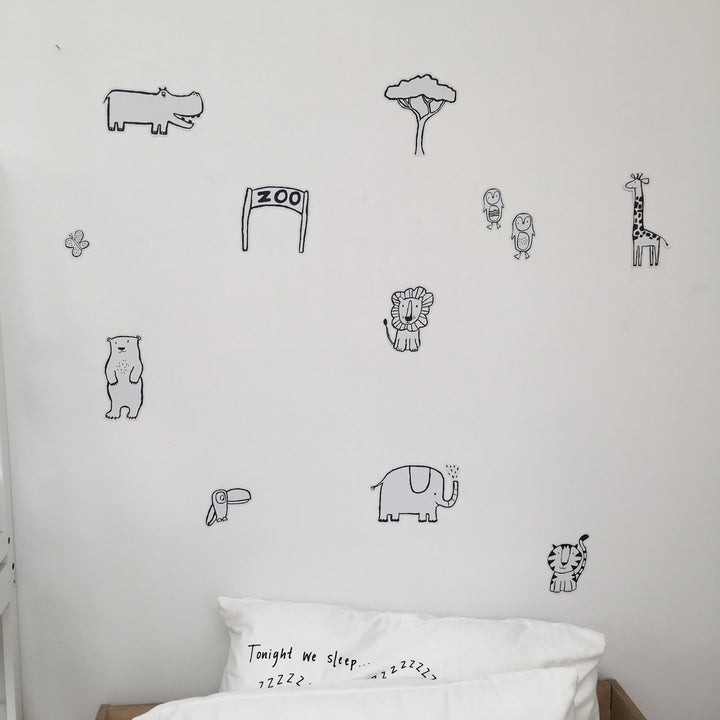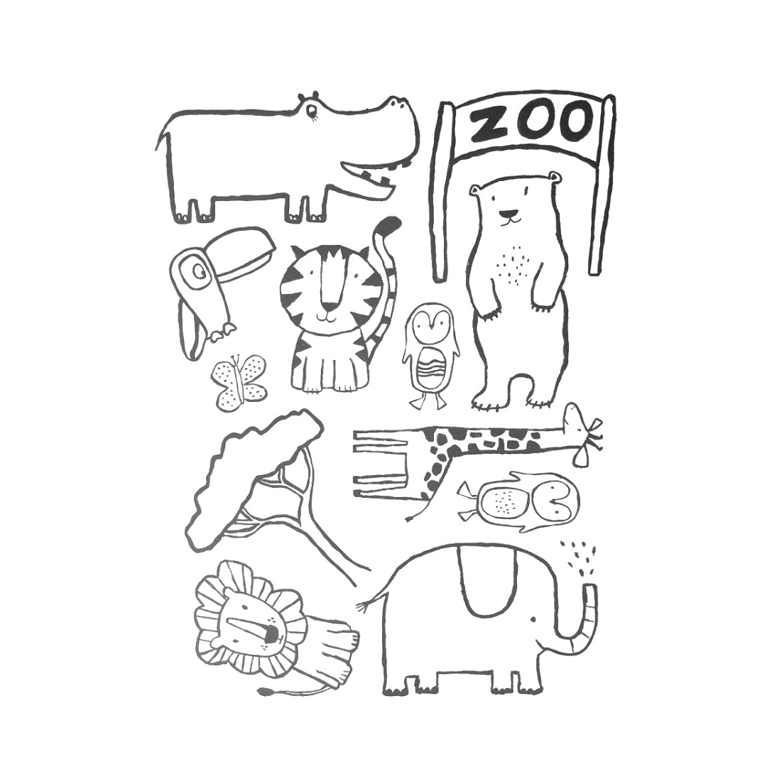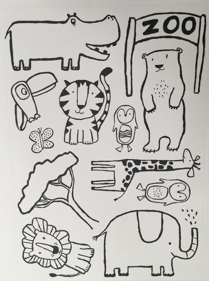 One of each of:  Bear, Penguin, Tiger, Toucan, Butterfly, Lion, Hippo, Giraffe, Elephant and a Zoo sign.