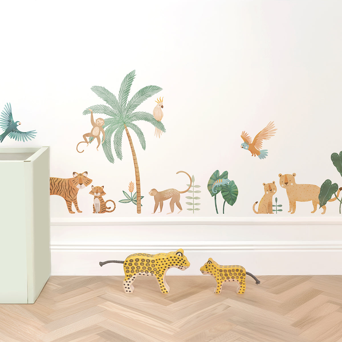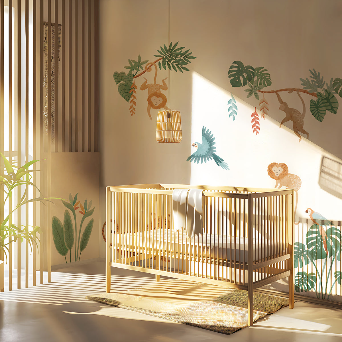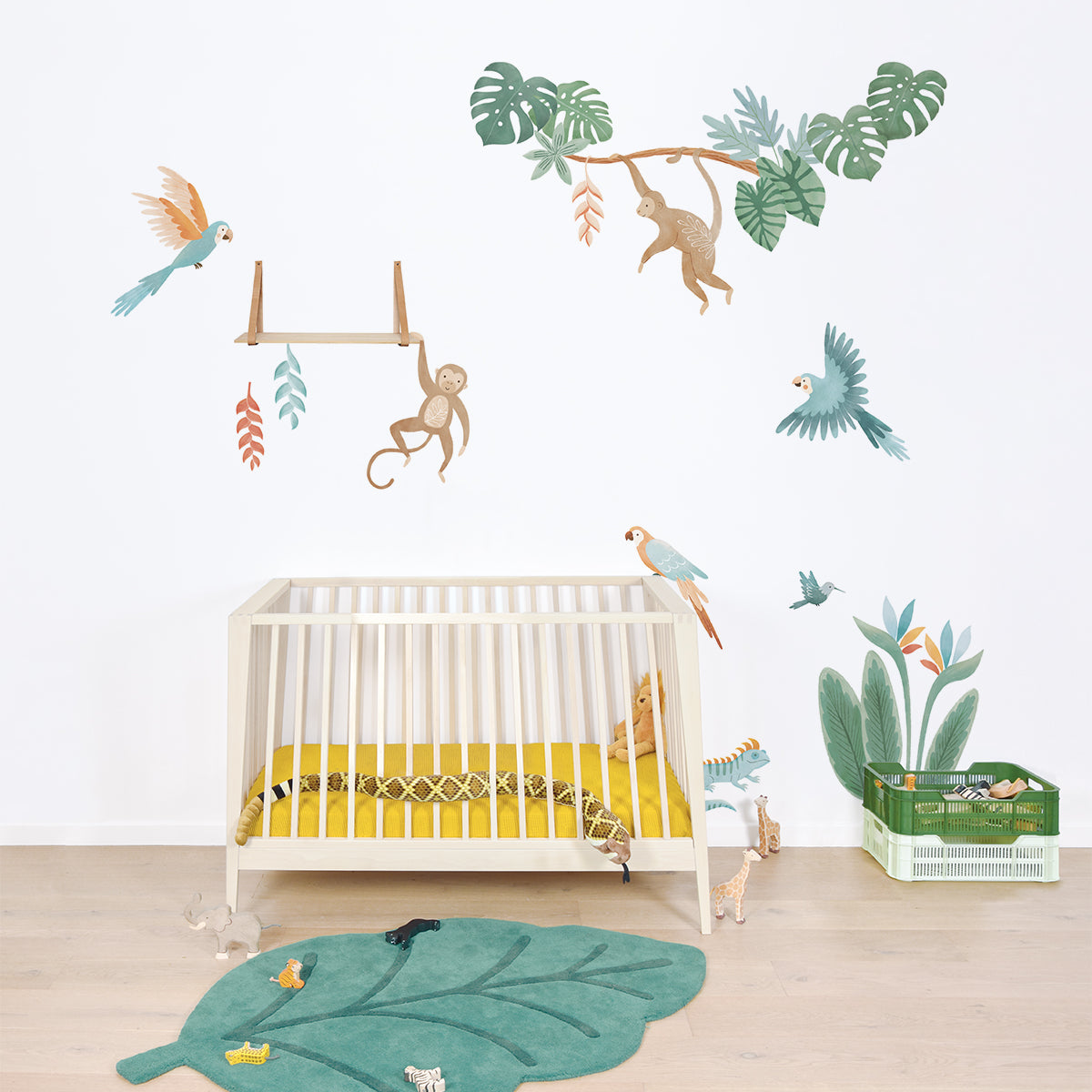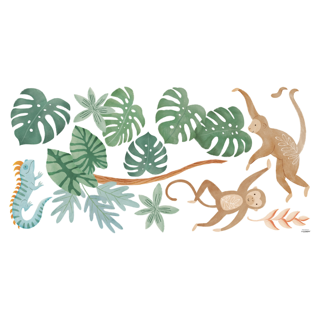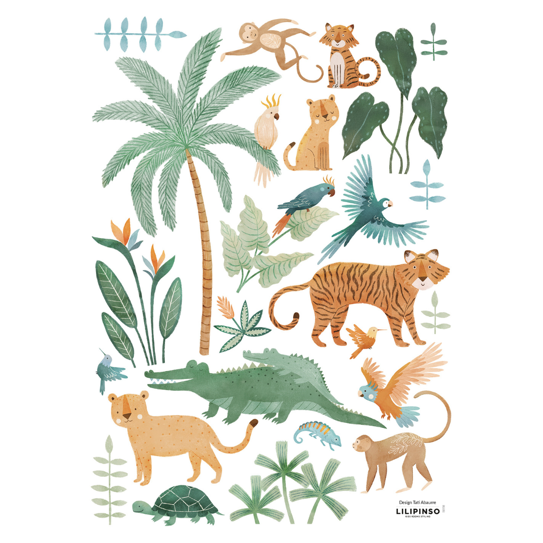 The exotic charm of parrots, crocodile, jaguar, lion, and monkeys right into your child's bedroom, creating a colorful and refreshing tropical haven.