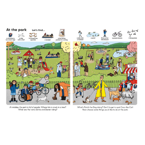 From an exciting town to a sunny beach, a beautiful park to a colourful toyshop, little ones visit their best-loved places, search through the busy scenes, then point to and name all sorts of delightful things, building their vocabulary. They follow entertaining characters like the little girl and her mum buying things for a birthday party, the young boy out and about with his grandparents, and playful Patch, the mischievous pup. They count scampering squirrels, fluttery butterflies, flying birds, and more. Plus there are favourite toys and fabulous treats to find, and a cool cat is hiding somewhere in each scene!