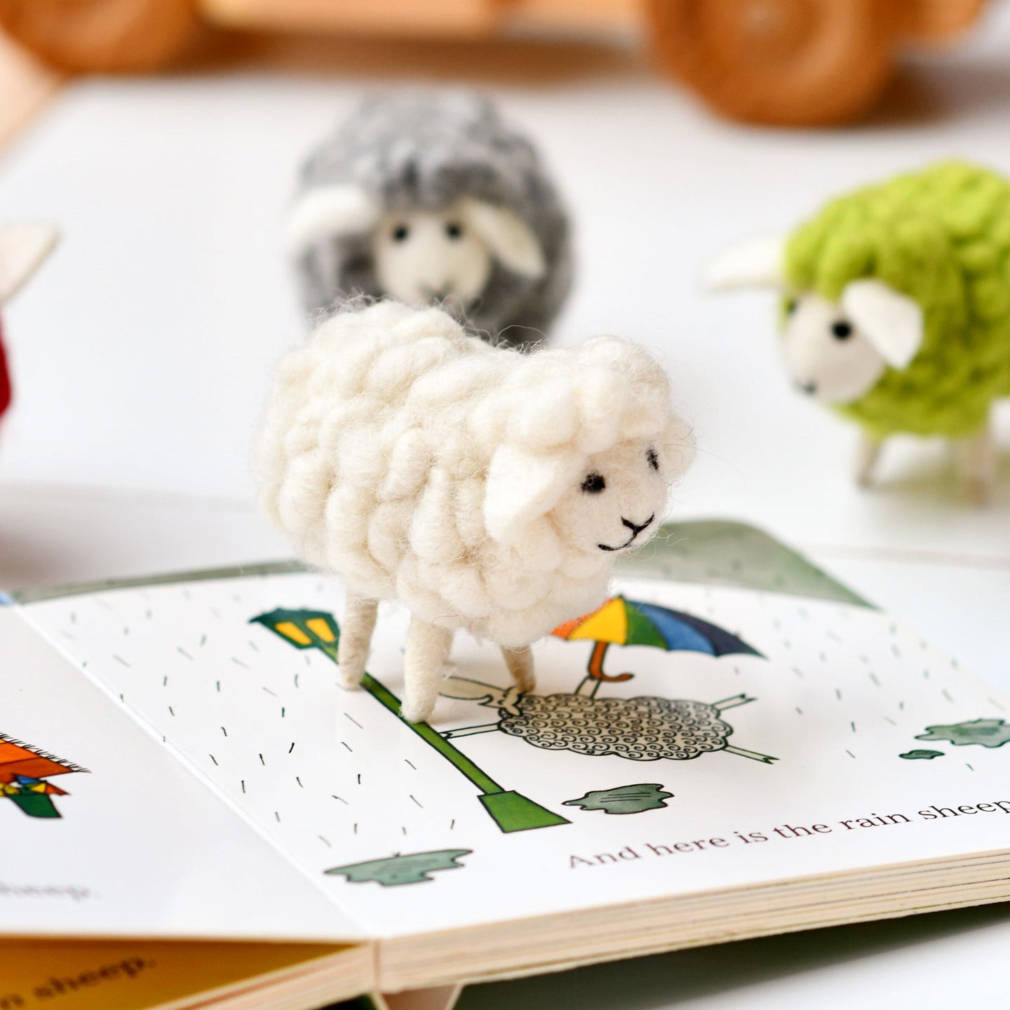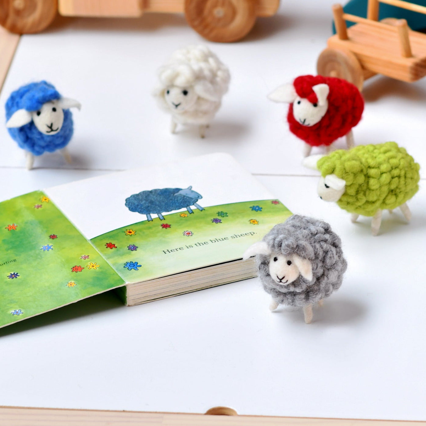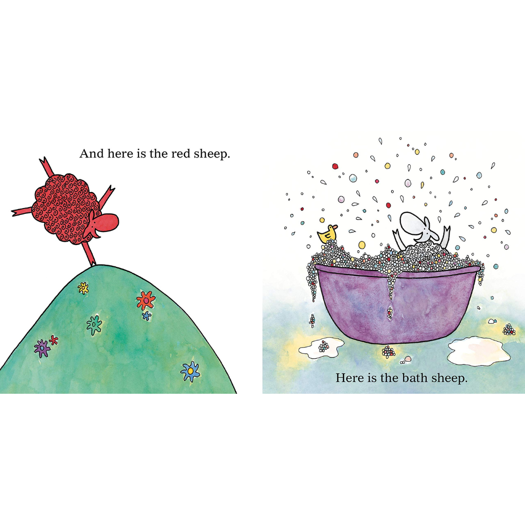 Here is the blue sheep, and here is the red sheep. Here is the bath sheep, and here is the bed sheep. But where is the green sheep?