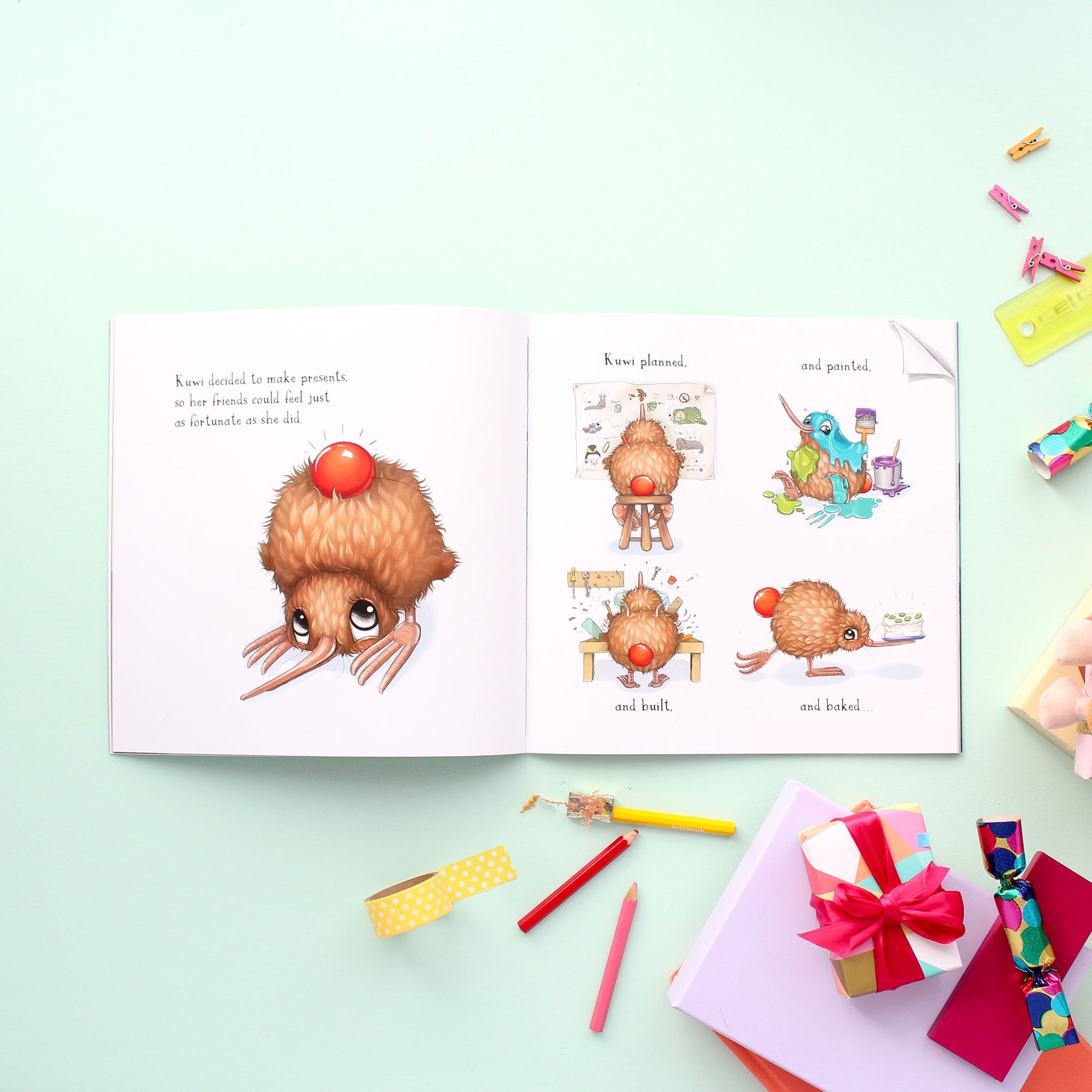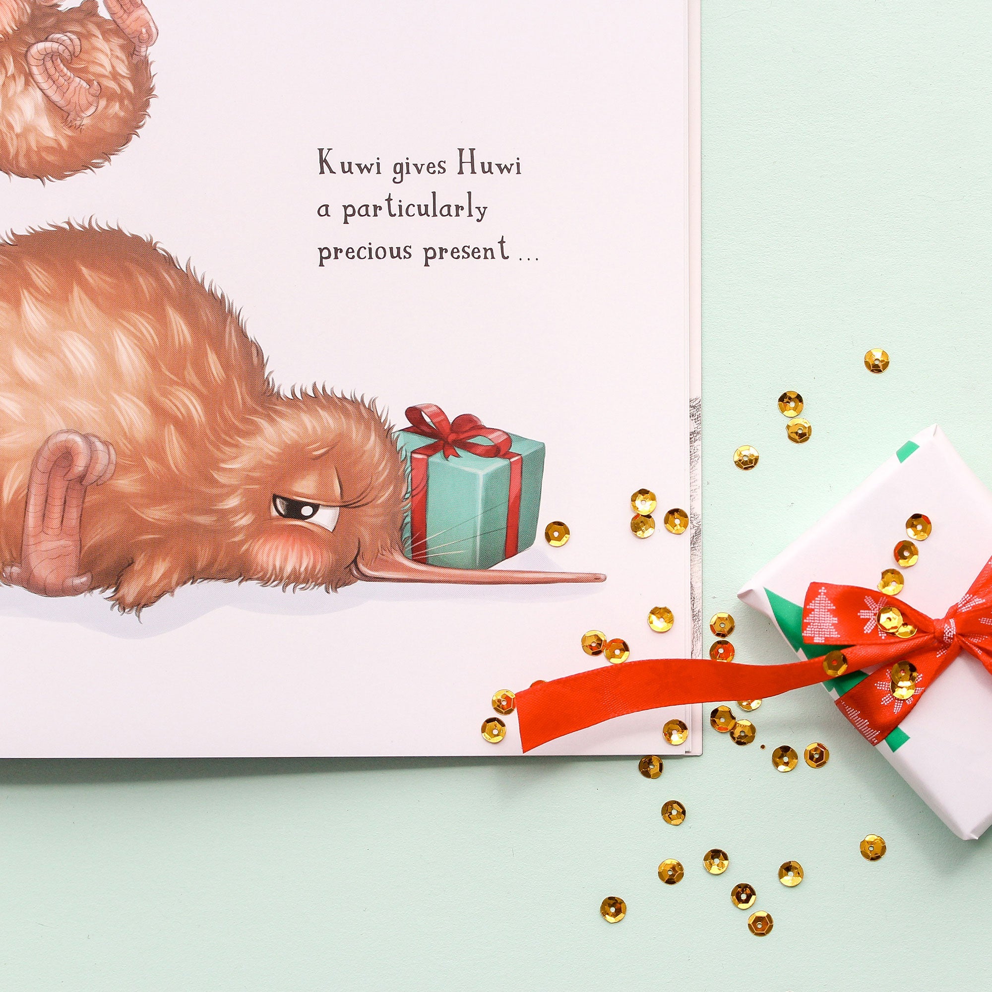 With the faint jingle of bells, a mysterious gift falls from the sky. It is a shimmering red ball. Kuwi knows exactly what it is. A very shiny bum. She decides to make gifts, so her friends can feel as blessed as she does. A hula hoop for Herb the hippy hōiho. Tasteful trimmings for Tash the tuft-less tūī. A moustache for Morris the meek morepork... but wait, no ‘thank yous’?