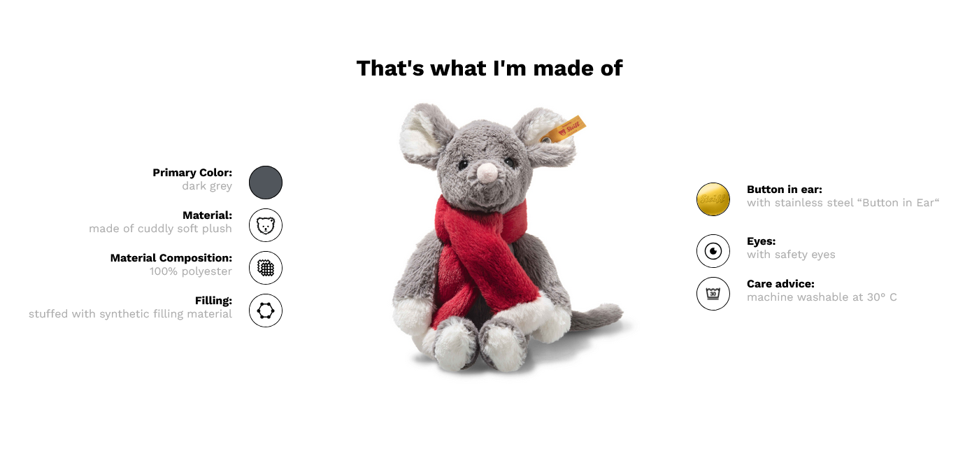 With her scarf wrapped snugly and ears perked up, Mia Maus is ready for the magical Christmas season. Her soft grey fur, fluffy ears and red scarf make Cosy Christmas Mia Mouse perfectly dressed for the most wonderful time of the year. Sitting cosily on her white little paws, this 21 cm mouse enchants with a loving gaze – ideal for cuddling, dreaming and all those heartwarming moments in the run-up to Christmas Eve. Her cuddly material and wintry charm make her a heart-warming companion for festive fans of all ages. With the iconic “Button in Ear”, Mia Mouse becomes a snuggly piece of Christmas magic to hold and treasure.